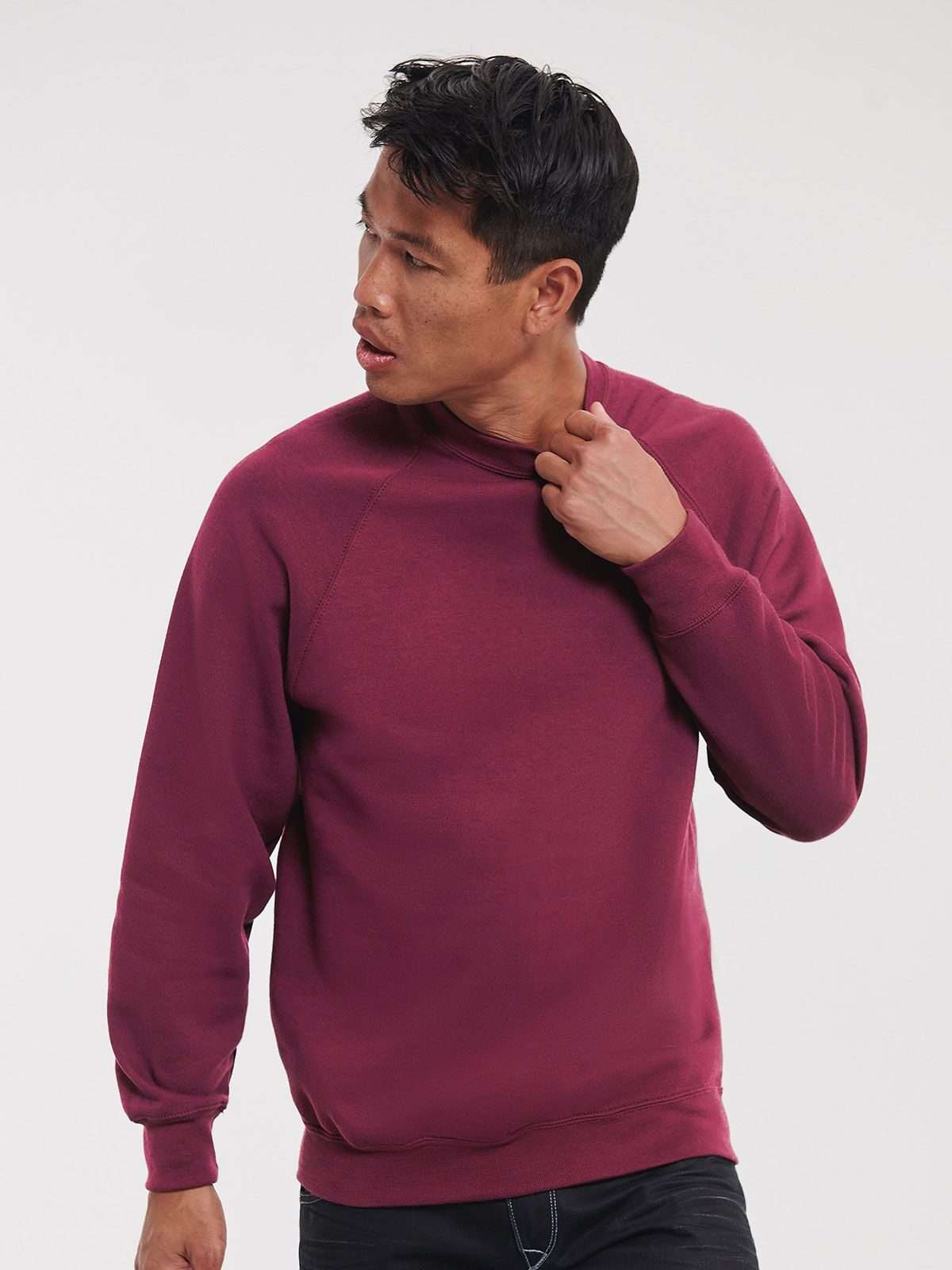 50% cotone ring-spun, 50% poliestere. Felpa con maniche raglan, felpata internamente, struttura con busto tubolare.