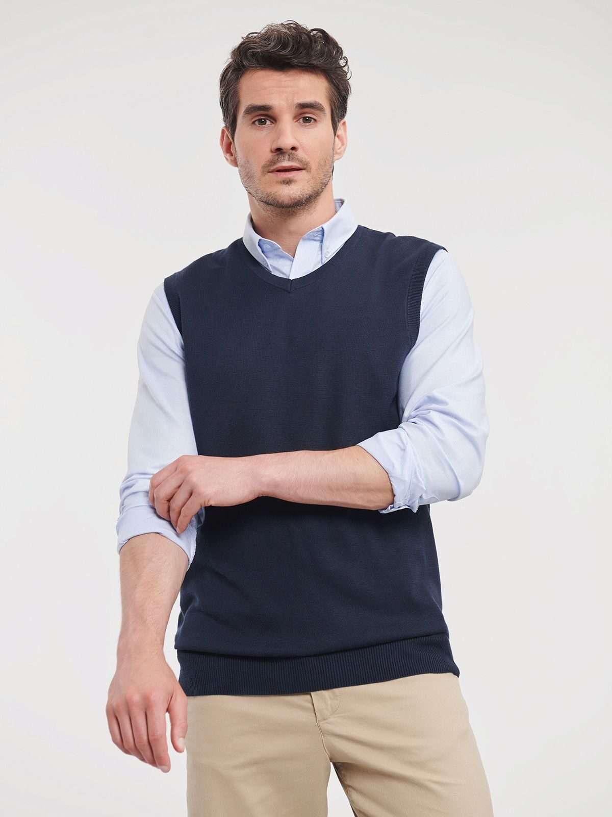 50% cotone, 50% acrilico. Gilet uomo con scollo a V costina 1x1. Polsini e girovita con elastane, lavabile a 40°c. Cuciture laterali.