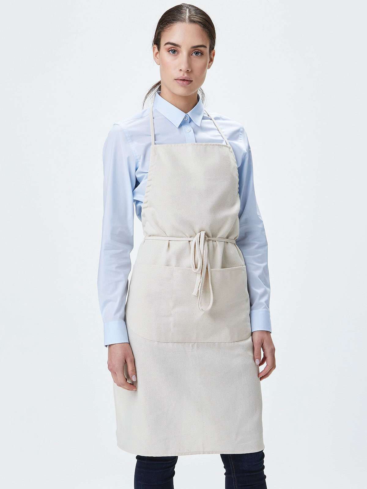 100% cotone . Grembiule con pettorina, laccio scorrevole, ampia tasca centrale con tre compartimenti separati. Lavabile a 40°C.