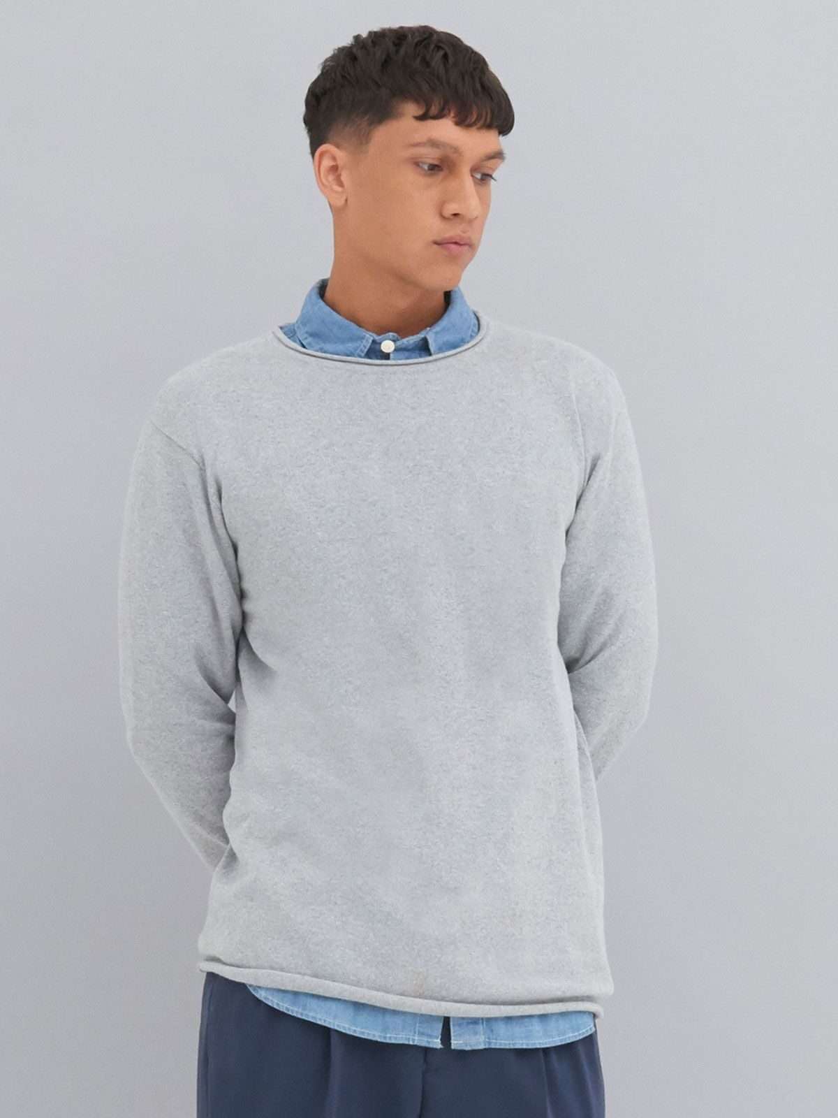 70% cotone rigenerato 30% poliestere riciclato. Maglione unisex in jersey leggero, sobrio ma elegante, con colletto, polsini e orlo arrotolati. Al collo, solo etichetta taglia.