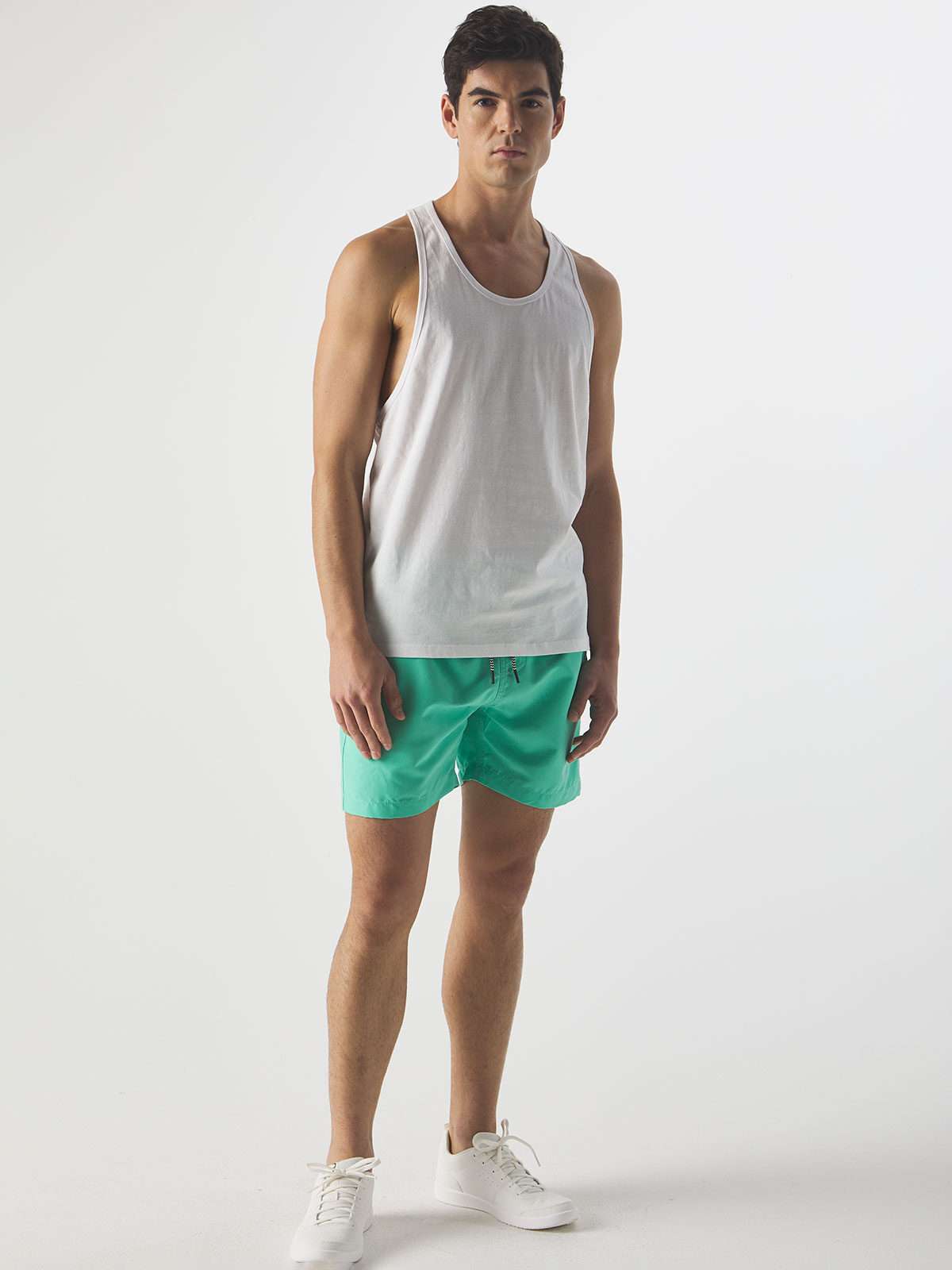 100% poliestere riciclato. Costume da bagno uomo in tessuto riciclato, ad asciugatura rapida. Slip interno a rete tono su tono. 2 tasche laterali, tasca sul retro a filetto con chiusura in velcro, cordoncino in contrasto con punte in metallo, occhielli in metallo. Lavabile a 30°C. Etichetta strappabile.
