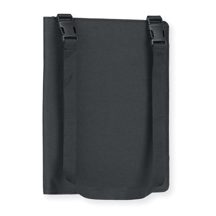 cartella sottobraccio; tracolla regolabile; interno multitasche; porta carte di credito; tasca per inserimento del blocco; portapenne con molla; blocco incluso