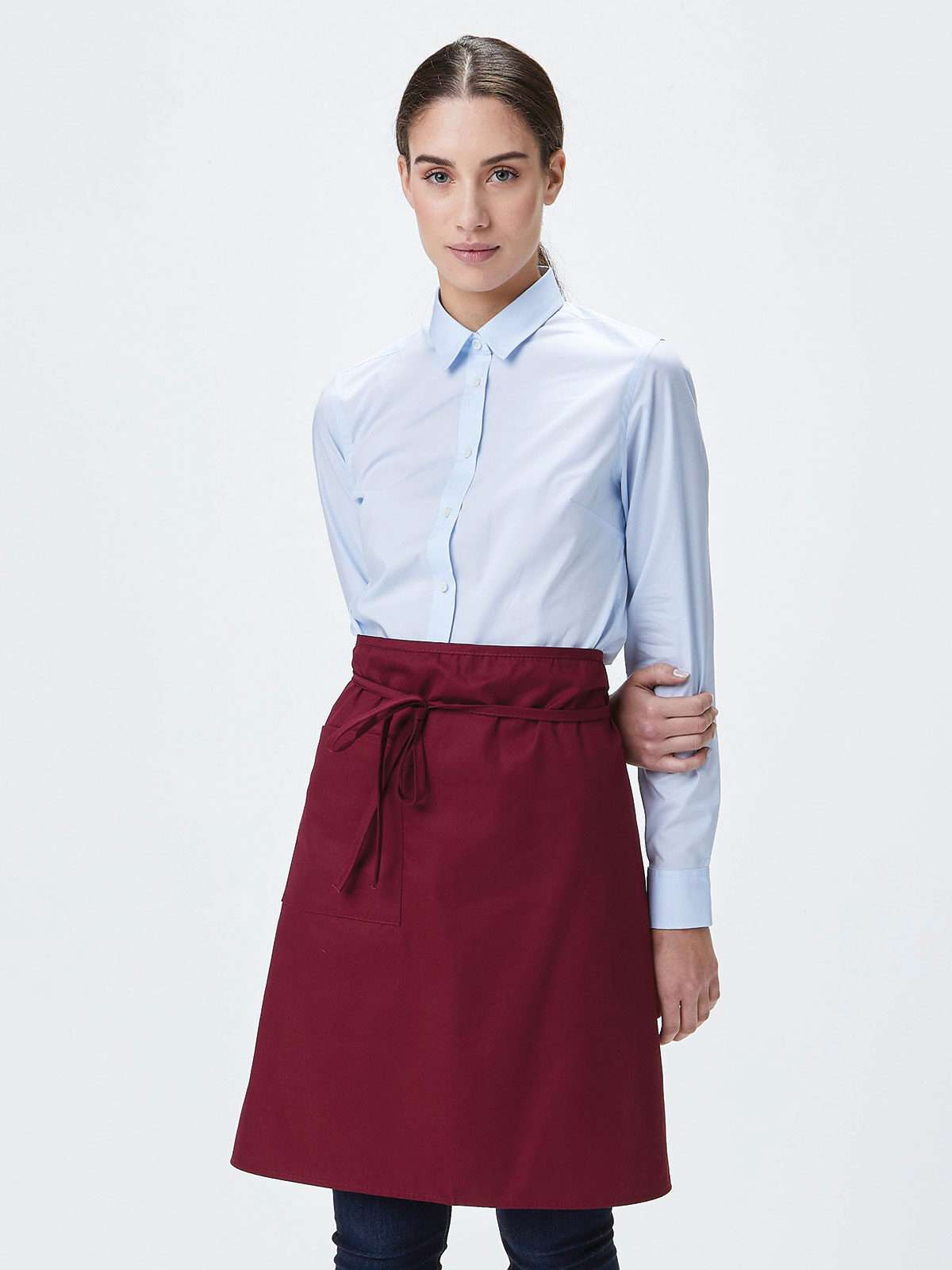 65% poliestere, 35% cotone. Grembiule stile bar con tasca laterale e lunga cintura. Prodotto in Italia. Lavabile a 40°C. (Col WH: 100% cot.)