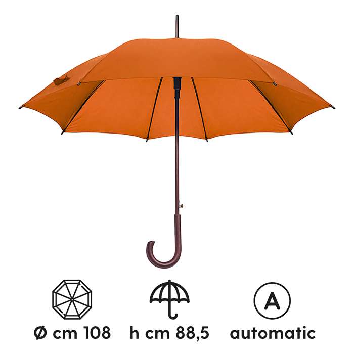 ombrello automatico in nylon taffet�� 170T; sistema di apertura con meccanica di alta qualit��; struttura in fibra di vetro; fusto e puntale in legno impermeabilizzato; manico in legno con finitura opaca; chiusura con velcro; tecnica di stampa consigliata: serigrafica - sublimatica (BI) - transfer