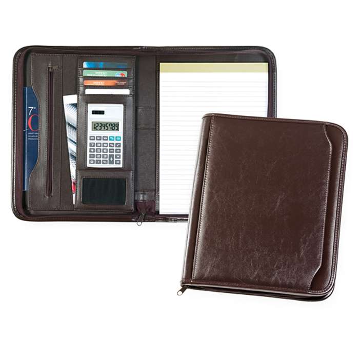 cartella sottobraccio; interno multitasche; blocco per appunti e calcolatrice 8 cifre; chiusura con cerniera; corredata di astuccio; tecnica di stampa consigliata: serigrafica - UV
