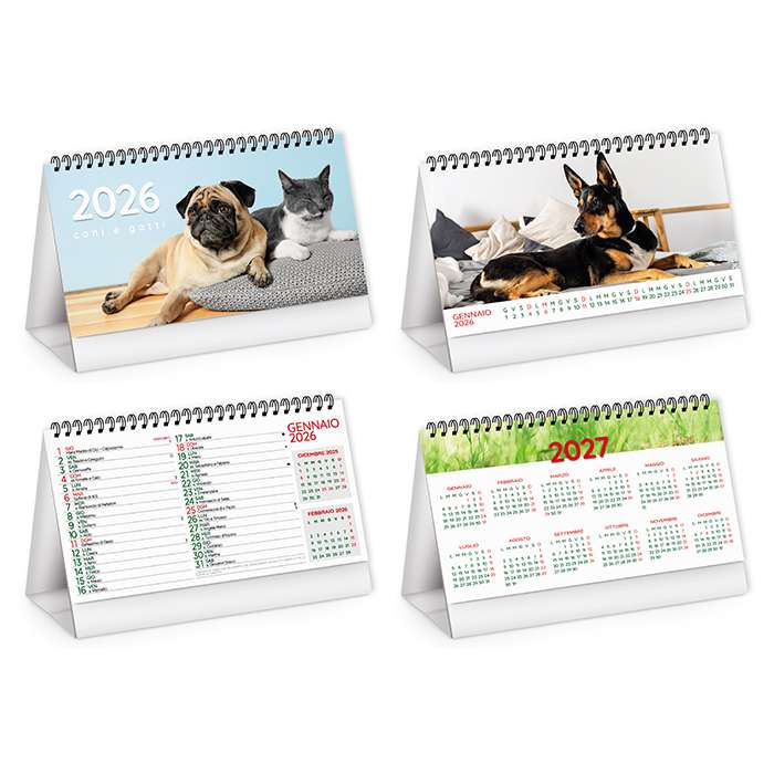 calendarietto spiralato da tavolo; illustrato mensile 13 fogli; carta patinata 90gr; tabella anno 2026 in ultima pagina; festivit�� internazionali; supporto cartoncino bianco; tecnica di stampa consigliata: adesivo digitale - serigrafica