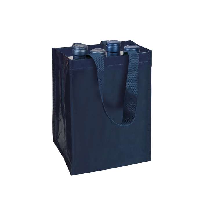 borsa vino in polipropilene; manici lunghi; soffietto; 4 scomparti interni; finitura lucida