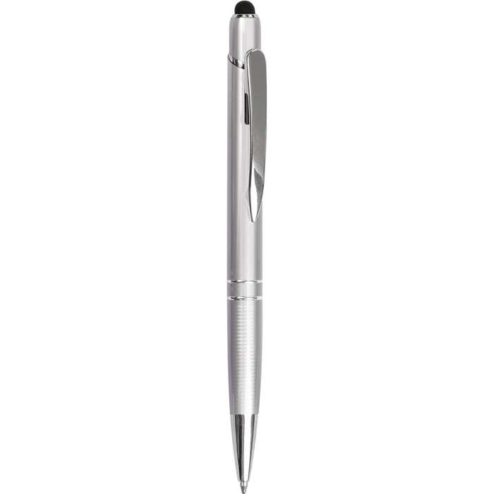 penna a scatto in alluminio ex codice N0103; fusto colorato; clip in metallo; gommino touch screen; minuterie cromate; refill nero; tecnica di stampa consigliata: laser