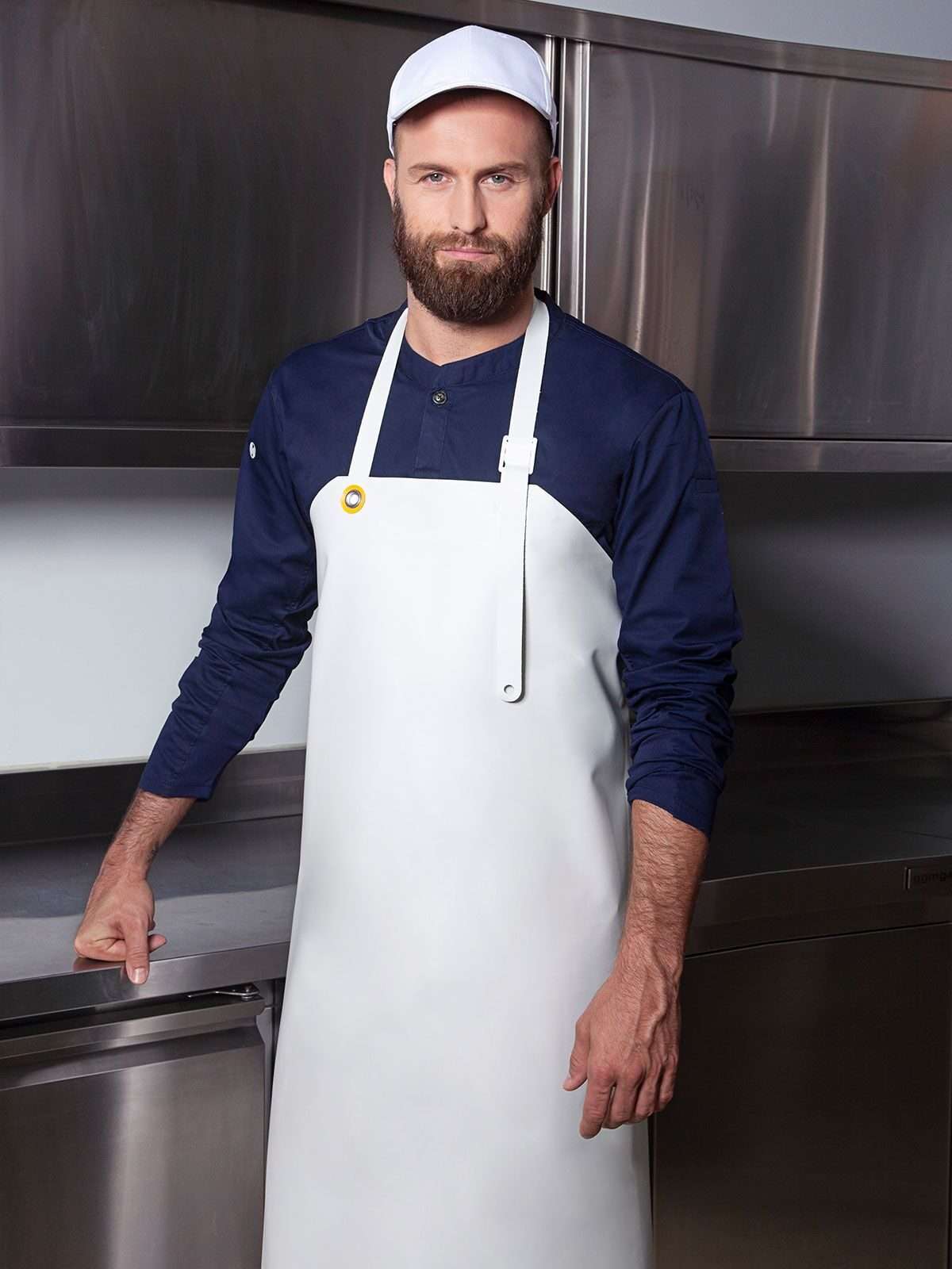 100% poliestere. Grembiule con pettorina rivestito con cinta per il collo e sul retro. Impiego nel settore agricolo e alimentare - DPI (dispositivi di protezione individuale): Categoria I. Nastro della pettorina con fibbia in polipropilene per alimenti per la regolazione continua della lunghezza, cinta elastica in polipropilene con ganci in plastica all´altezza della vita (regolazione flessibile), occhielli e dischetti in ottone, senza nichel. Pulizia semplice mediante spazzolatura con acqua e sapone a 40°C o con una miscela di acqua e detergente delicato. Misure: 90 x 115 cm.
