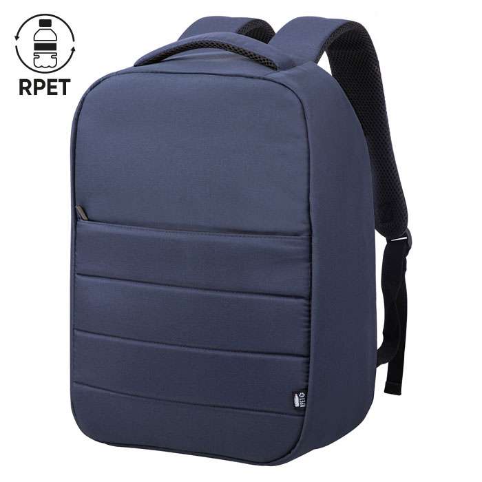 zaino in RPET 300D; sistema di chiusura sul retro antitaccheggio; tasca interna imbottita porta pc/tablet; fascia trolley posteriore; retro e spallacci imbottiti; laptop fino a 15