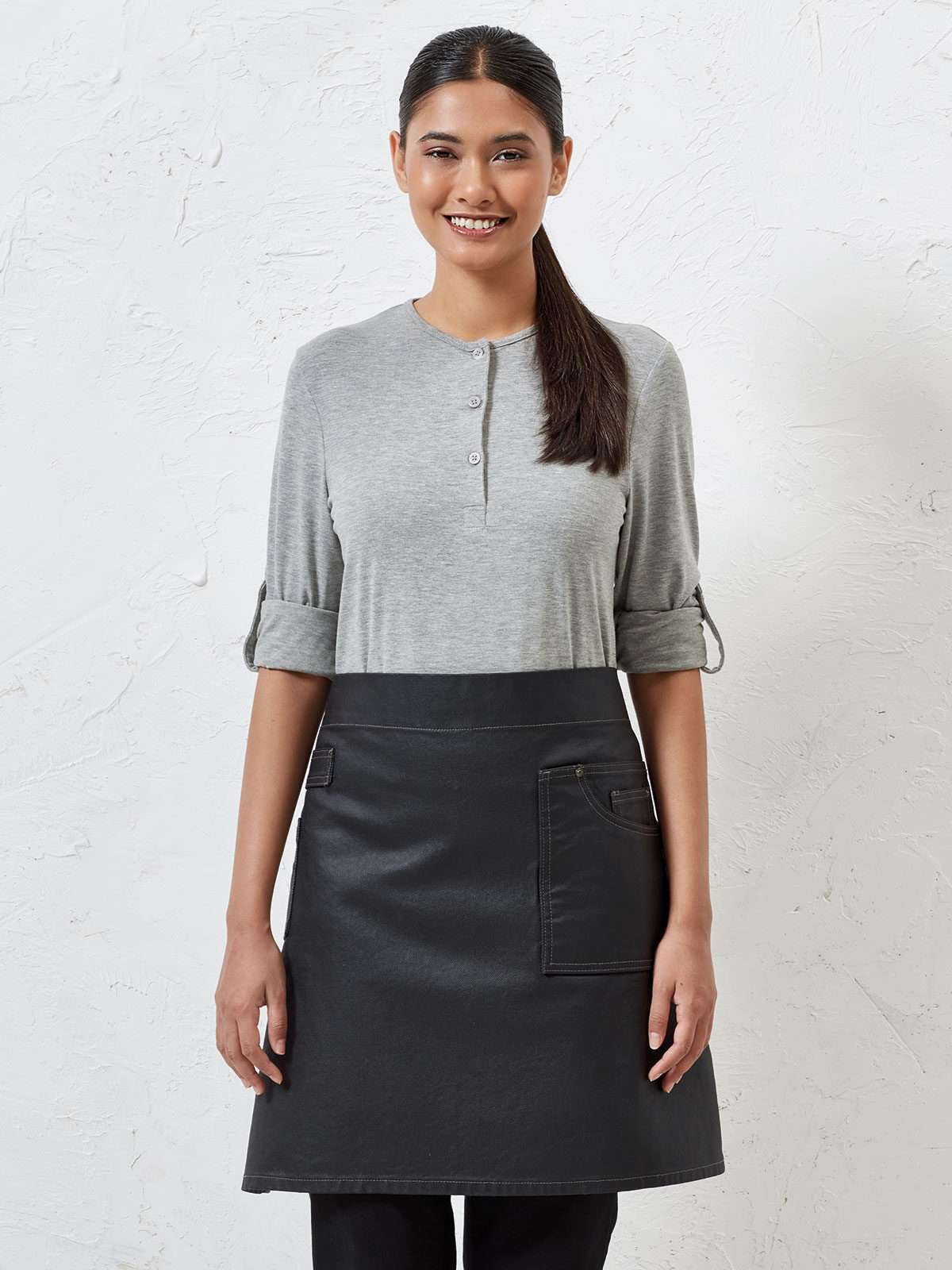 100% Cotone Denim Twill con rivestimento acrilico. Grembiule con finitura in acrilico che crea una protezione impermeabile, cuciture e tessuto di jeans a contrasto, una tasca di grandi dimensioni applicata e una di servizio. Lavabile a 60°C. Cordoni in vita lunghi 1 metro ciascuno.