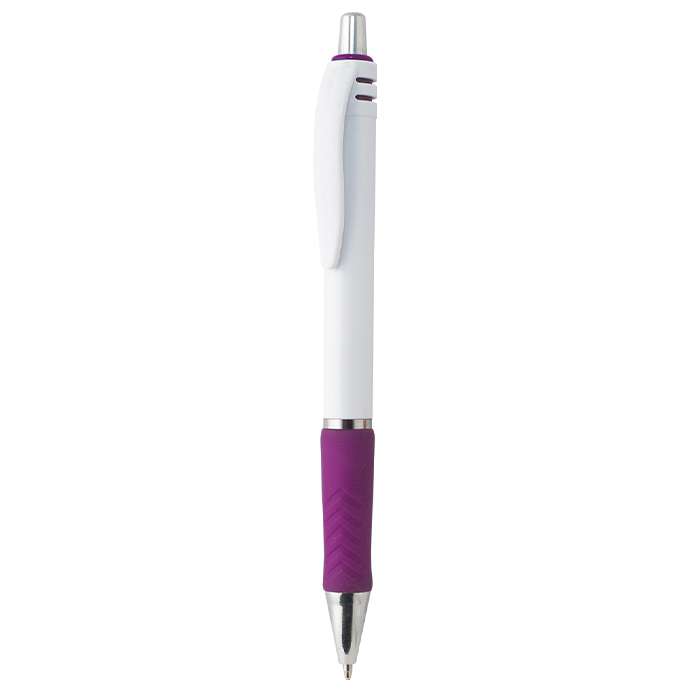 penna a scatto in ABS ex codice N0054; fusto bianco; grip gommato colorato; minuterie cromate; refill nero; tecnica di stampa consigliata: UV