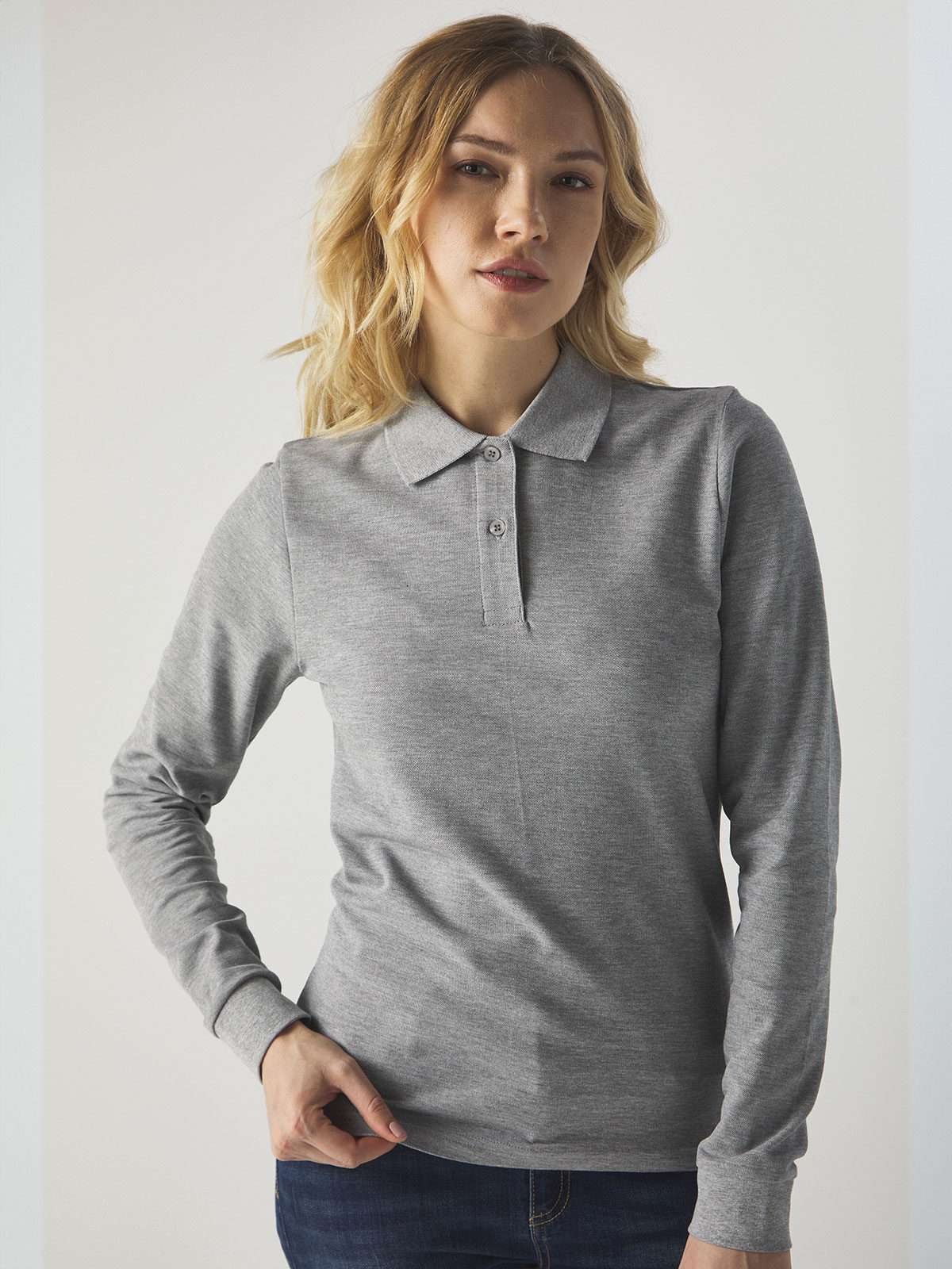 100% cotone piqué. Polo donna a maniche lunghe set-in con costine, 2 bottoni tono su tono, nastro di rinforzo al collo, struttura con cuciture e spacchetti laterali. Etichetta strappabile.Composizione: Grey Heather: 85% cot. 15% visc.