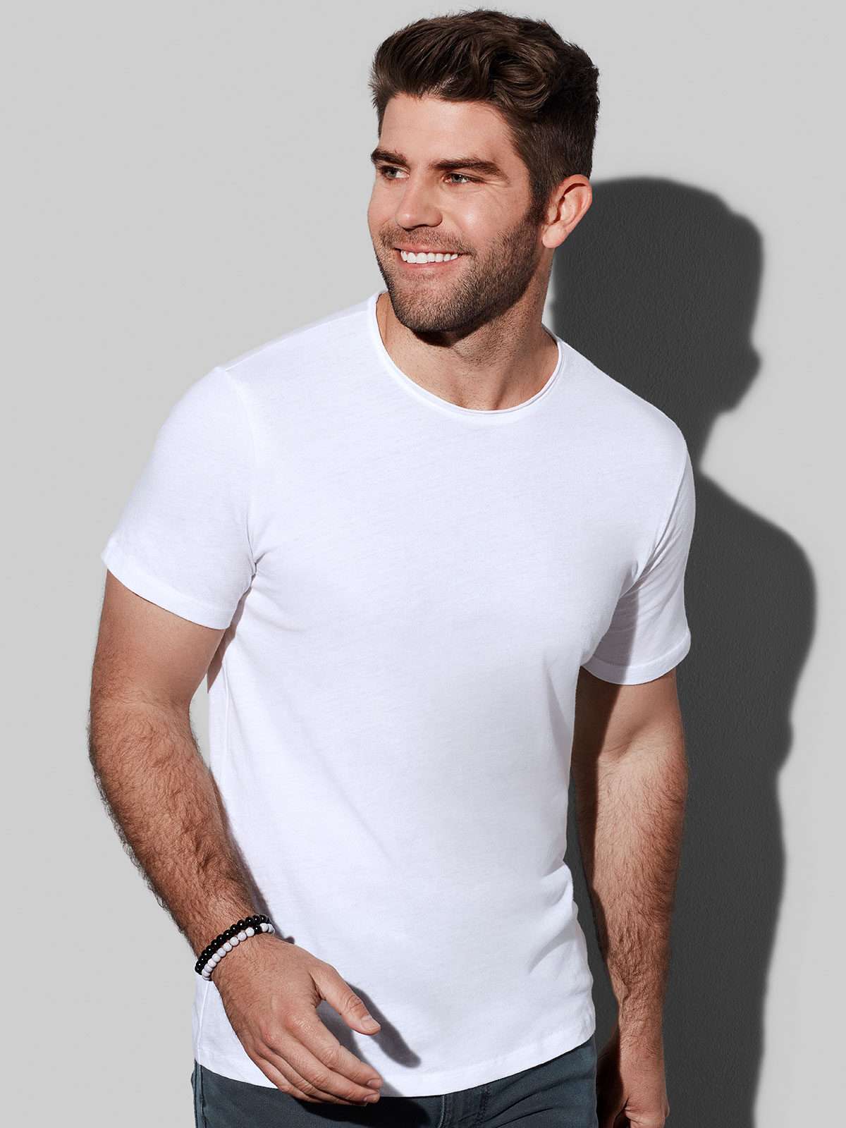 100% cotone ring-spun pettinato. Single jersey. T-shirt manica corta girocollo, collo rollino nello stesso tessuto, nastro di rinforzo alle spalle, struttura con cuciture laterali, etichetta strappabile.