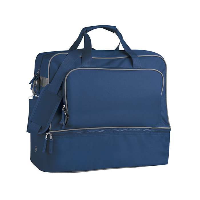 borsone sport poliestere 600D; vano scarpiera con pareti rigide pieghevoli h16cm; tascone esterno con cerniera; portanome laterale; tiralampo in tessuto; piedini in plastica; tracolla regolabile e sganciabile; salvaspalla imbottito; doppio manico con chiusura in velcro; tecnica di stampa consigliata: serigrafica - transfer