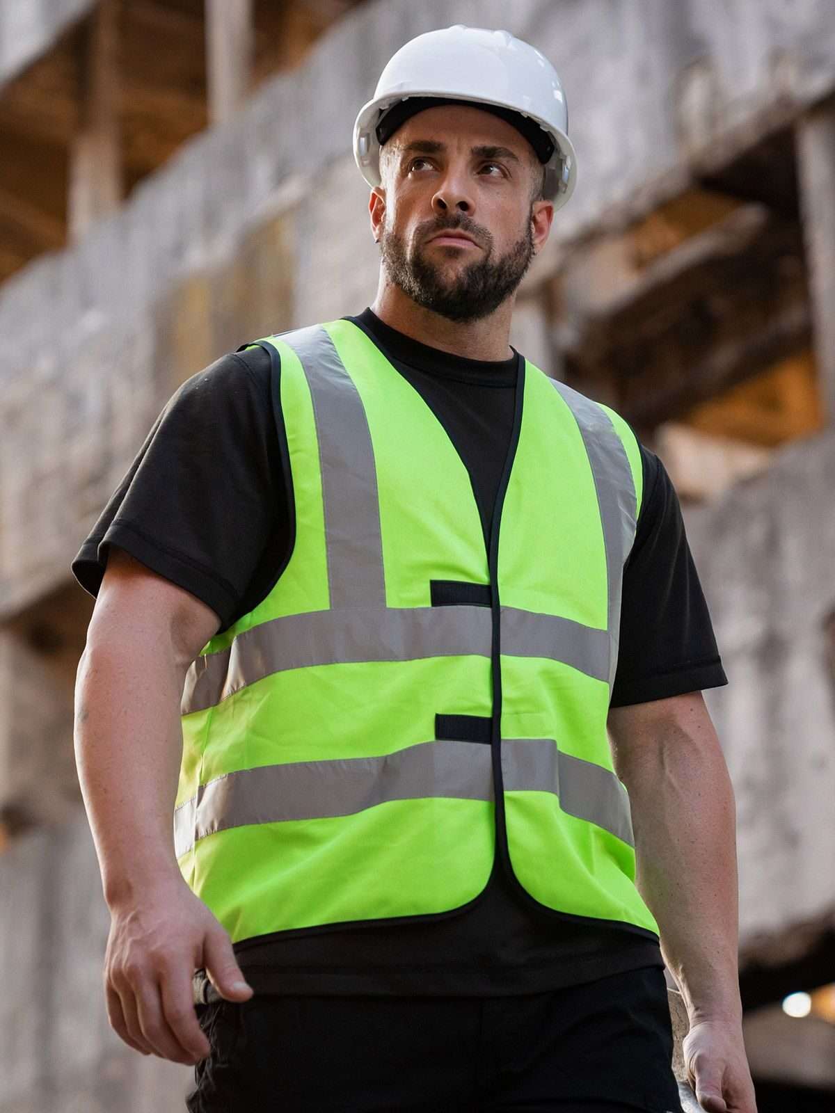 100% poliestere. Gilet di sicurezza con quattro fasce riflettenti. Colori giallo e arancione conformi alla normativa EN ISO 20471:2013 + A1:2016, Oeko-Tex® Standard 100, colore arancione conforme anche alla normativa GO/RT 3279, altri colori non conformi alla normativa EN ISO 20471:2013 + A1:2016. Due fasce riflettenti larghe 5 cm intorno al corpo, due fasce riflettenti larghe 5 cm perpendicolari alle spalle, misura regolabile grazie alla doppia chiusura con velcro, durata delle proprietà riflettenti in conformità alla normativa EN per 25 cicli di lavaggio a 40°C. Confezionato singolarmente in una pratica borsa in polietilene. Classe 1 da S a XXL, classe 2 da 3XL a 5XL.