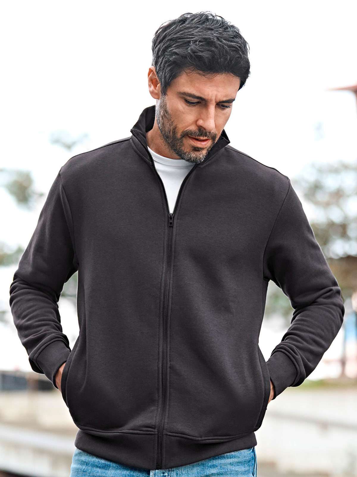 70% cotone 30% poliestere. Felpa zip intera, polsini elastici con cuciture doppie, colletto alto e orlo in costina, due tasche frontali con zip. Tessuto a tre fili, felpato internamente.