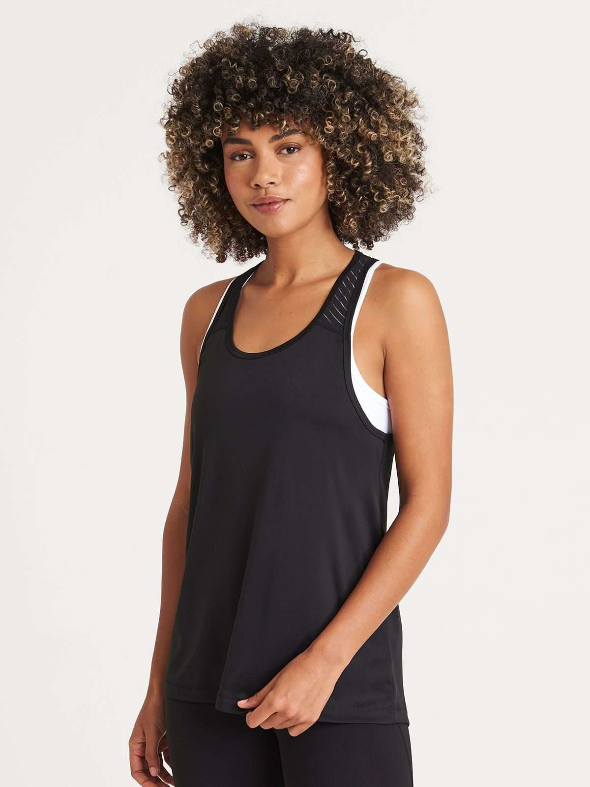 100% poliestere. Canotta sportiva girocollo, leggermente sfiancata, struttura con cuciture laterali, etichetta strappabile, inserti di colore contrastante.