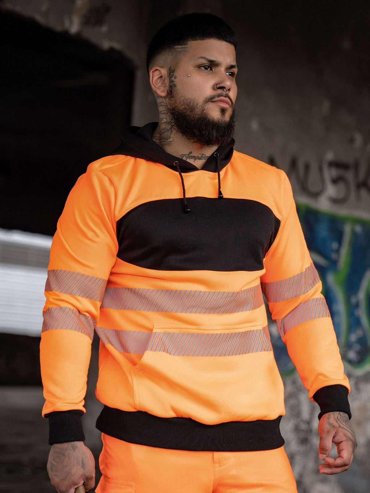 65% cotone, 35% poliestere. Felpa con cappuccio ad alta vestibiltà, certificato secondo le norme EN ISO 20471:2013/A1:2016 e EN 13758-1:2001 (UPF 40+), materiali STANDARD 100 di OEKO-TEX, due strisce riflettenti segmentate larghe 5 cm intorno al corpo e alle maniche polsini e orlo a costine nere, ampia area di stampa sul petto, tasca a canguro.