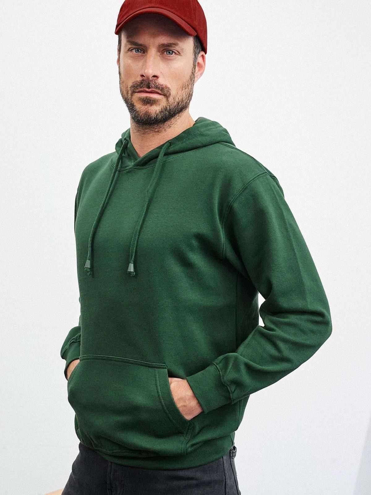 80% cotone, 20% poliestere. Felpa classica con cappuccio, Felpa di alta qualità con interno felpato, Necktape, bordino con elastan, grande tasca a marsupio, Cappuccio a doppio strato. Lavabile a 60° C, mantiene la forma, Tessuto esterno (300 g/m²). Manica lunga.