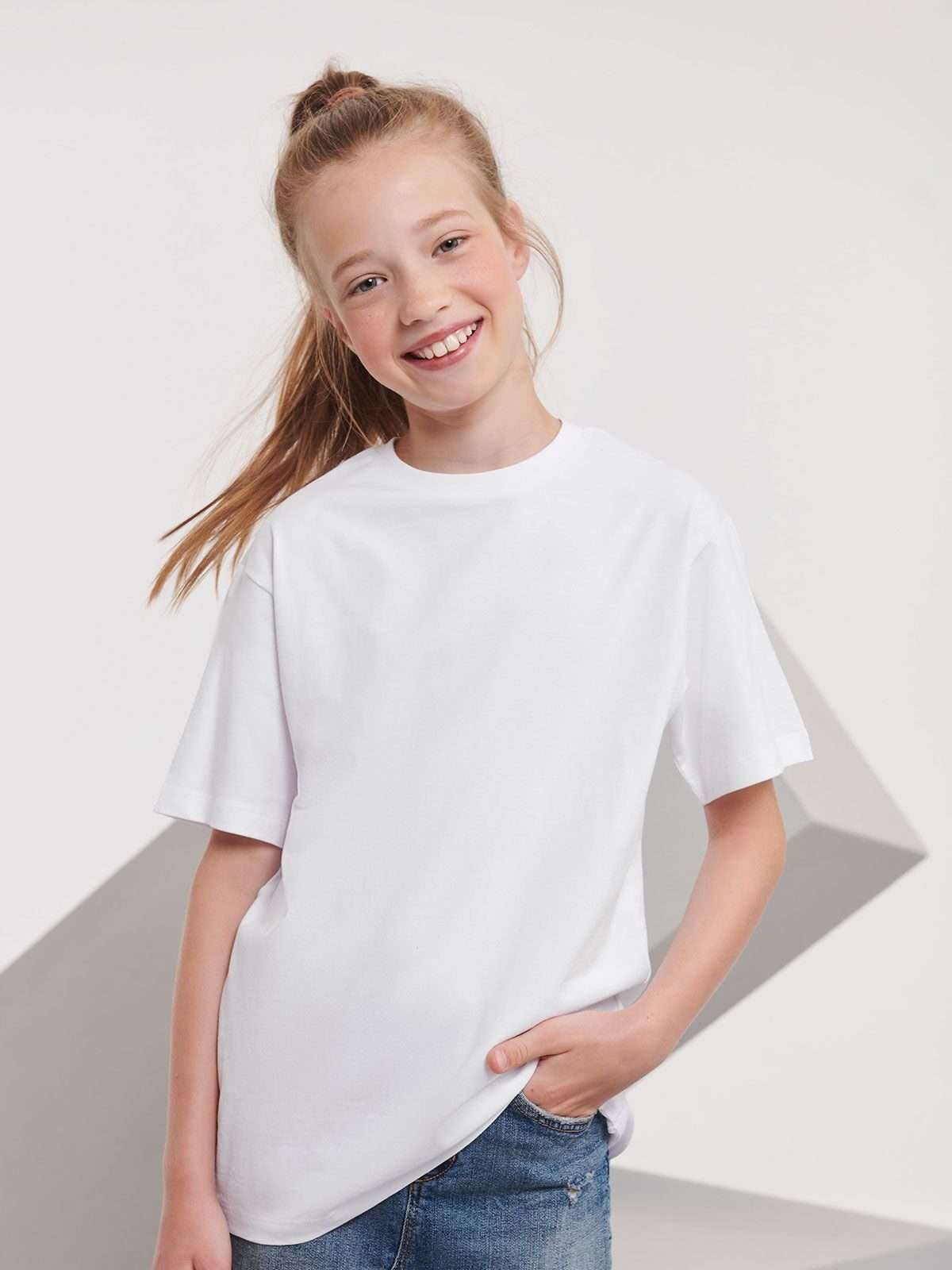 100% Cotone organico pettinato ring spun. T-shirt da bambino girocollo manica corta con cuciture laterali per un taglio attillato moderno e colletto basso in LYCRA® , nastro di rinforzo da spalla a spalla su misura per una maggiore stabilità, superficie liscia per un migliore risultato di stampa, piccola etichetta senza logo sul collo.