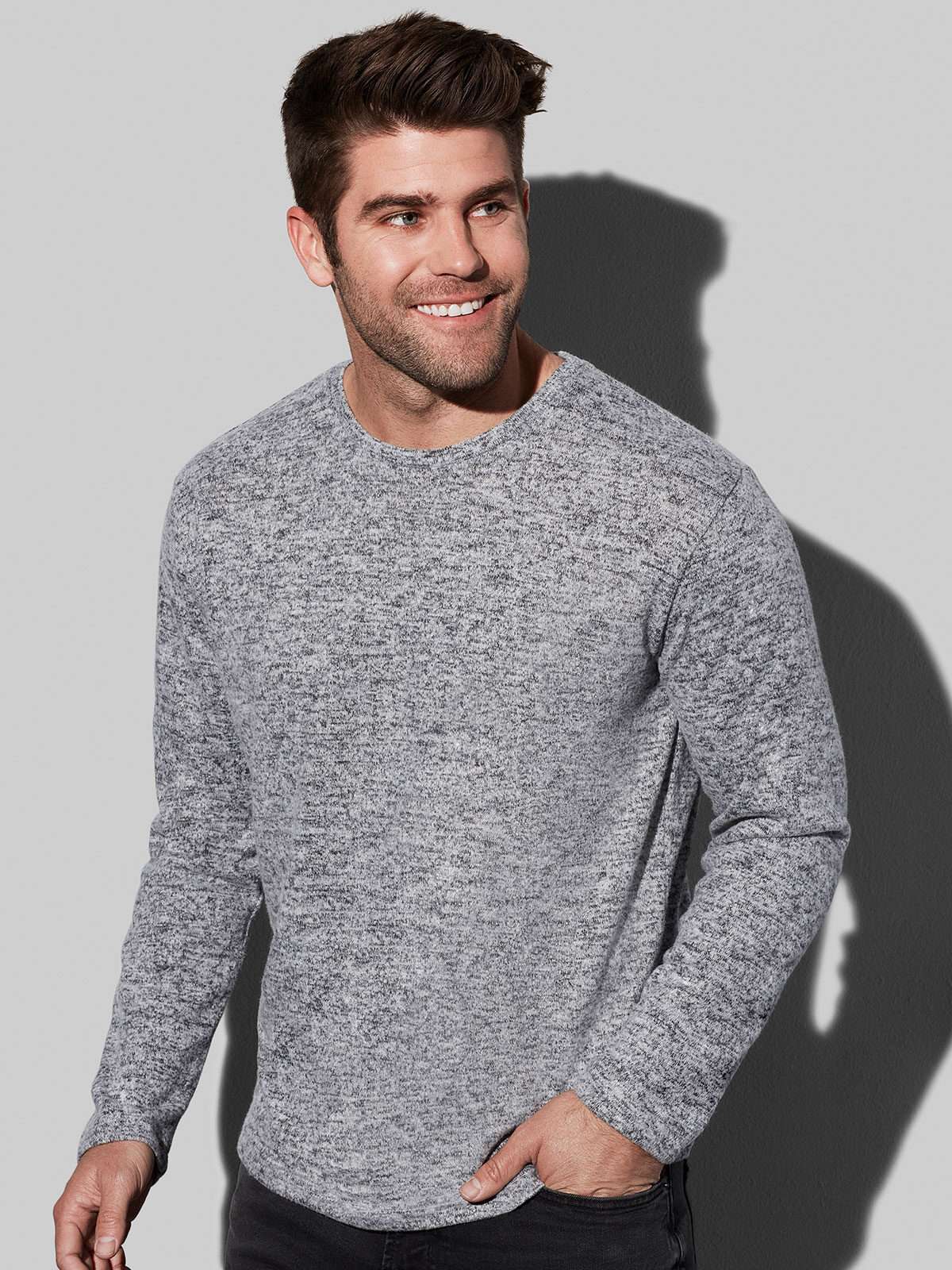 58% poliestere, 37% viscosa, 5% elastane. Pullover manica lunga da uomo, cuciture laterali, disponibile in diversi colori melange.