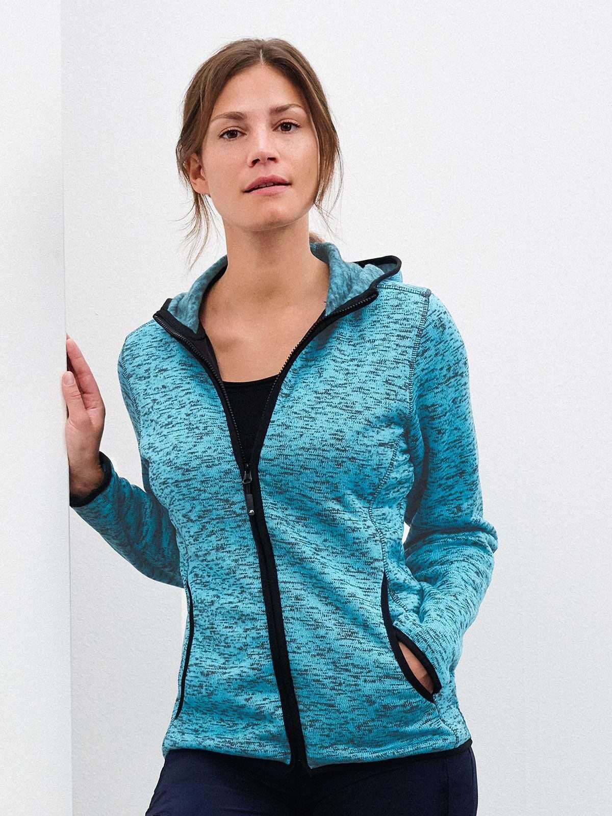 100% poliestere. Giacca con cappuccio in maglia in pile melange Tessuto morbido, caldo e facile da stirare. All'esterno appare come lavorato a maglia, all'interno soffice e morbido, Sottili cuciture divisorie, Cappuccio, Polsini a contrasto. 2 tasche sul davanti, leggermente avvitata. Tessuto esterno (320 g/m²).
