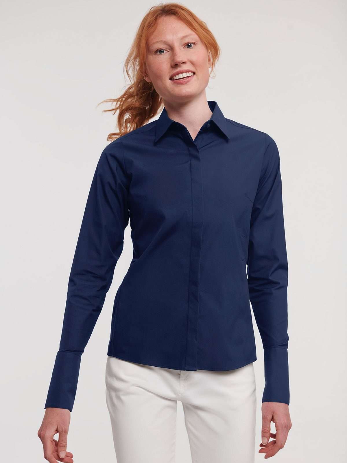 75% cotone 25% elastomultiestere (fibra di lycra® t400®). Camicia elasticizzata da donna, leggermente sfiancata. Pence sul retro, pattina stretta e polsini squadrati, controllo dell'umidità. (Col. 30: 125 g/m²)
