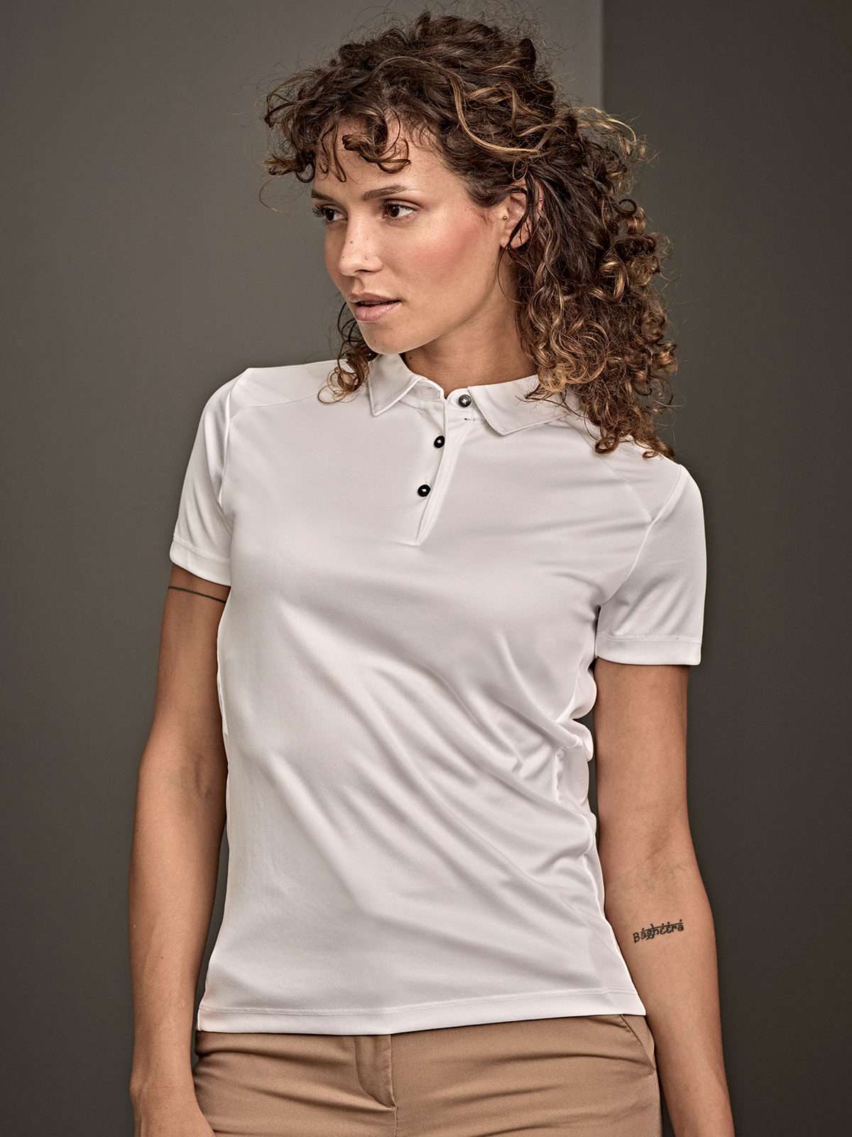 100% poliestere. Polo da donna in tessuto leggero e traspirante, maniche set-in, look sportivo e moderno, colletto foderato in tessuto, bottoni a contrasto color antracite, rifiniture del bordo in tessuto anti-umidità.