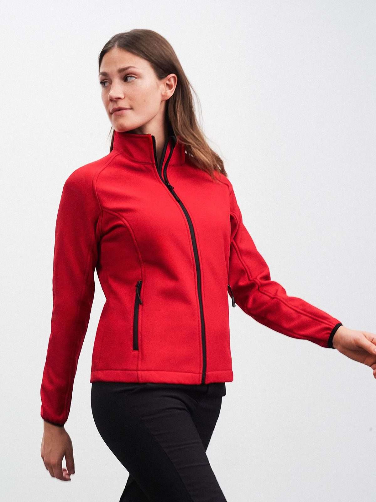100% poliestere. Giacca in softshell a due strati, idrorepellente, antivento e traspirante, parte interna in morbido micropile, zip frontale con protezione per il mento. 2 tasche laterali con zip, 2 tasche interne, polsini elastici, leggermente sfiancata.