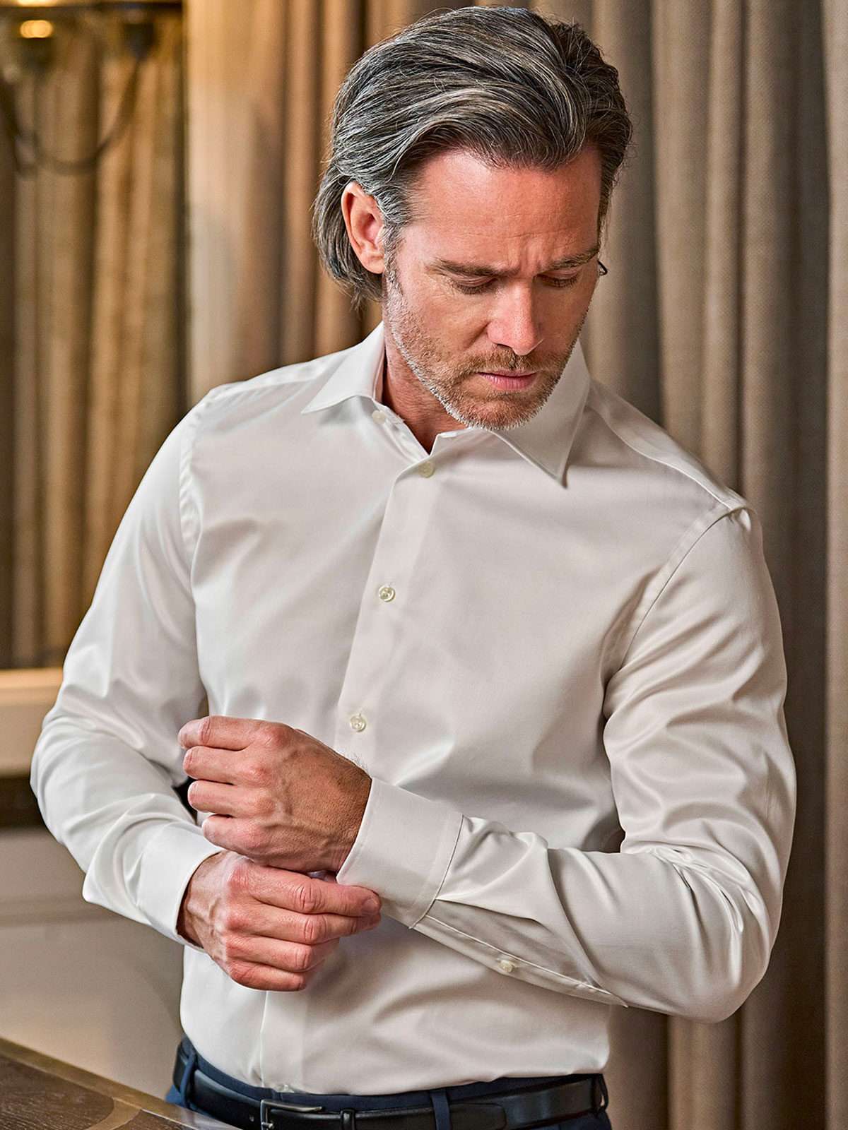 100% cotone twill tinto. Camicia elegante con colletto alla francese, e polsini con due bottoni carré posteriore, pinces sul retro, orlo stondato.