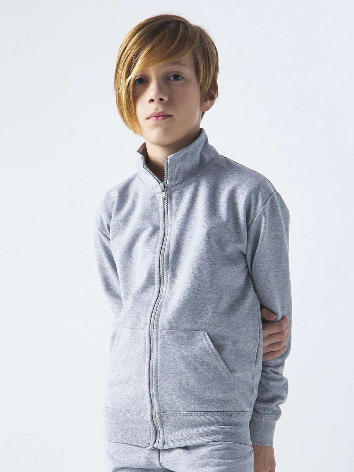 70% cotone, 30% poliestere. Felpa zip intera maniche lunghe set-in, tasca a marsupio, non felpata internamente.