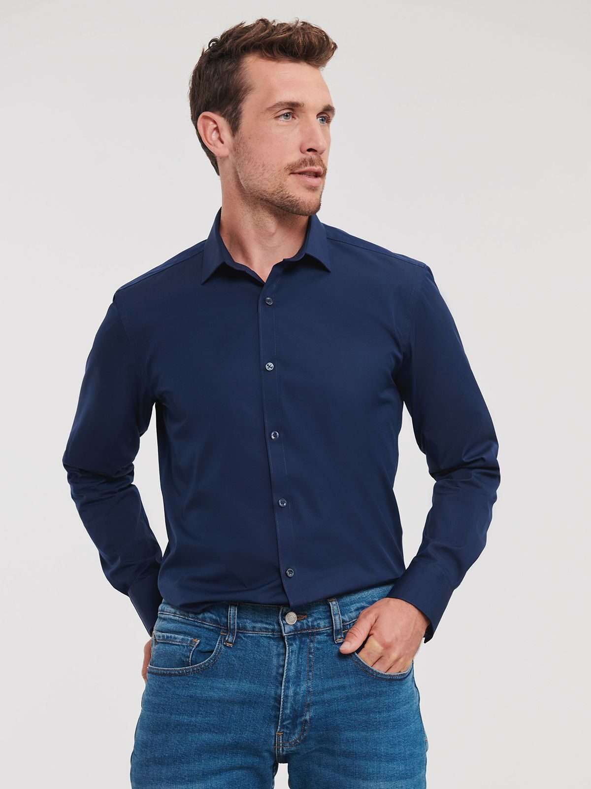 75% cotone 25% elastomultiestere (fibra di lycra® t400®). Camicia elasticizzata con pince sul retro, pattina stretta e polsini squadrati, controllo dell'umidità. (Col. 30: 125 g/m²)