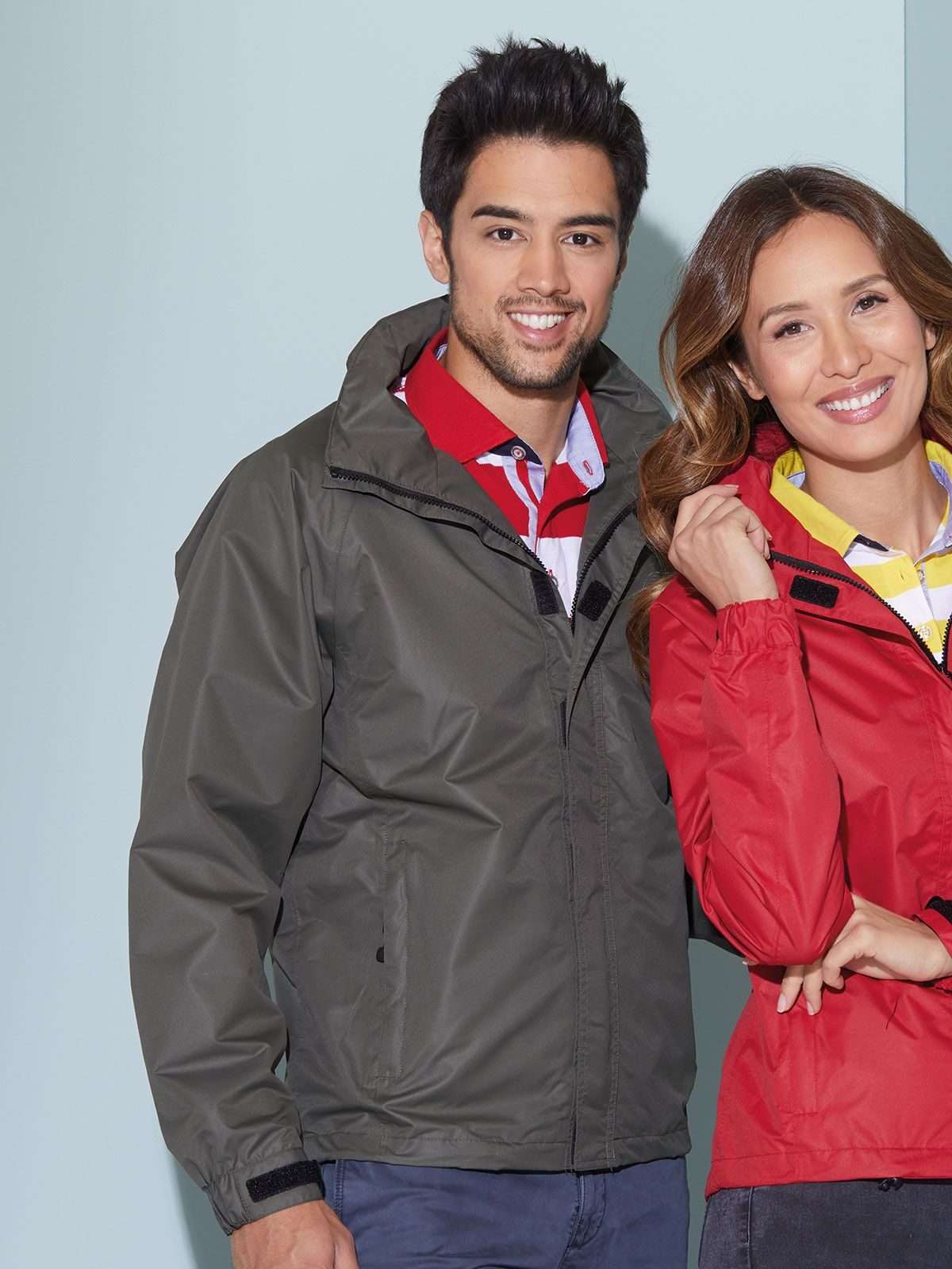 100% poliestere. Giacca funzionale dal tessuto antivento traspirante e idrorepellente, membrana TPU, cuciture sigillate, colletto con cappuccio integrato, due tasche nascoste con cerniera, tasca interna, cordino elastico con stopper su cappuccio e vita.