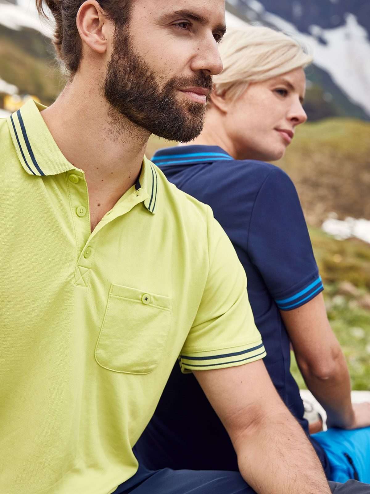 100% poliestere. Polo funzionale dalla vestibilità eccellente Poliestere funzionale di alta qualità (micropoliestere) Traspirante: regola l'umidità e si asciuga in fretta Protezione UV 25, Collo a polo in maglia e polsini con righe a contrasto, Taschino sul petto con bottone, Soffietti laterali, 3 bottoni, Tessuto esterno (160 g/m²).