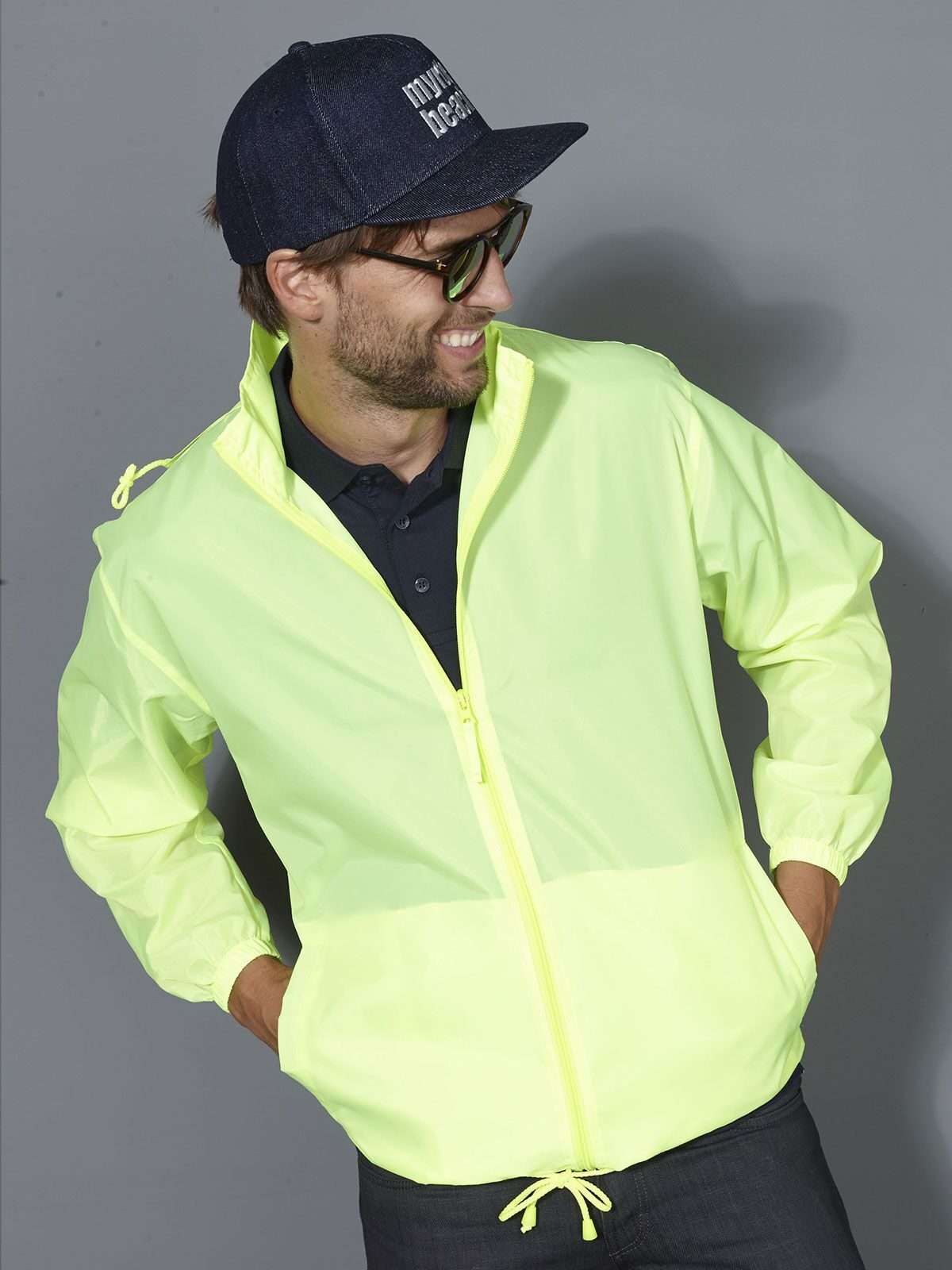 100% poliestere. Giacca dal tessuto leggero, antivento, idrorepellente (colonna d'acqua 600 mm) , 2 tasche laterali, cappuccio con cordoncino integrato nel collo, bande elastiche sulle maniche. La giacca può essere facilmente richiudibile nella tasca laterale.