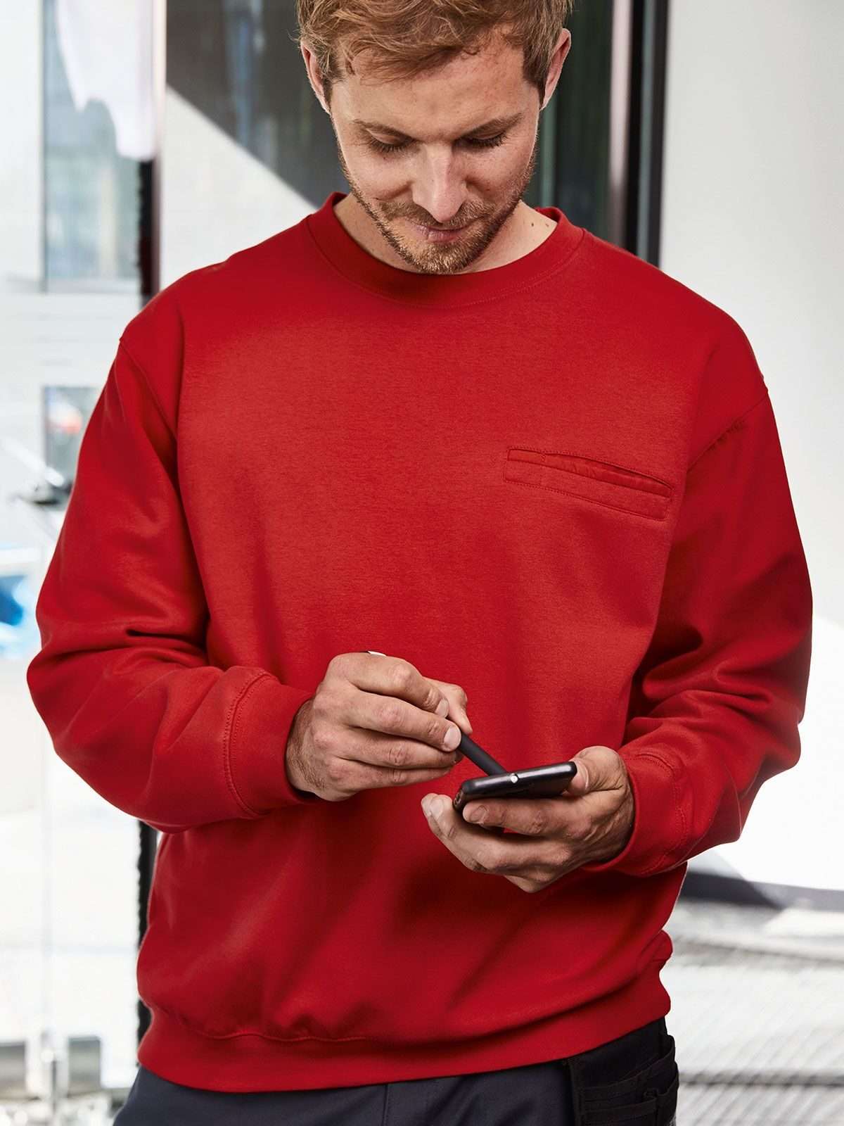 80% cotone, 20% poliestere. Sweat-Shirt classica con taschino Tessuto felpa di alta qualità con interno felpato. Doppie cuciture robuste sulle spalle, in vita, sullo scollo e sulla giromanica, girovita con elastan, Necktape e inserto mezzaluna sulla nuca, Taschino, Lavabile a 60°, mantiene la forma, Tessuto felpato a tre fili, Tessuto esterno (300 g/m²): Manica lunga, Professionale, Collo rotondo.
