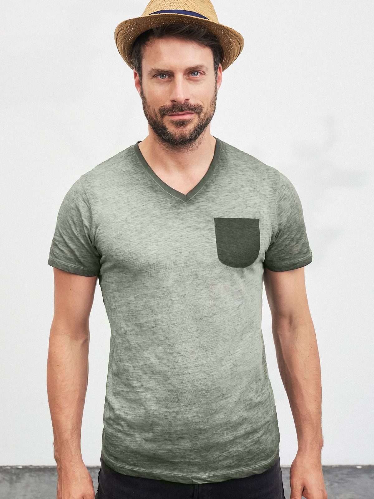 100% cotone organico fiammato. Single jersey. T-shirt manica corta set-in, scollo a V, tessuto slub, stile vintage. Polsini in elastane, taschino sul petto in colore contrastante.