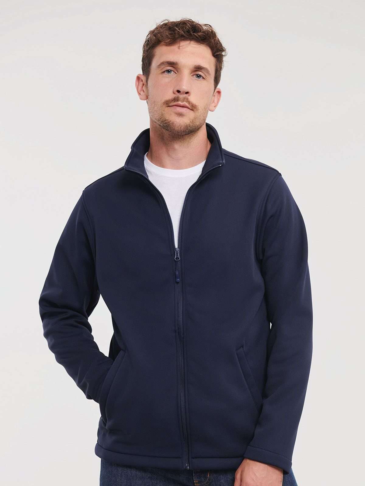 100% poliestere rivestito in DuPontTM Teflon DWR(Durable Water Resistance). Giacca in softshell, tessuto a doppio strato altamente traspirante e resistente a vento e acqua. Due tasche con zip, interno in micropile.