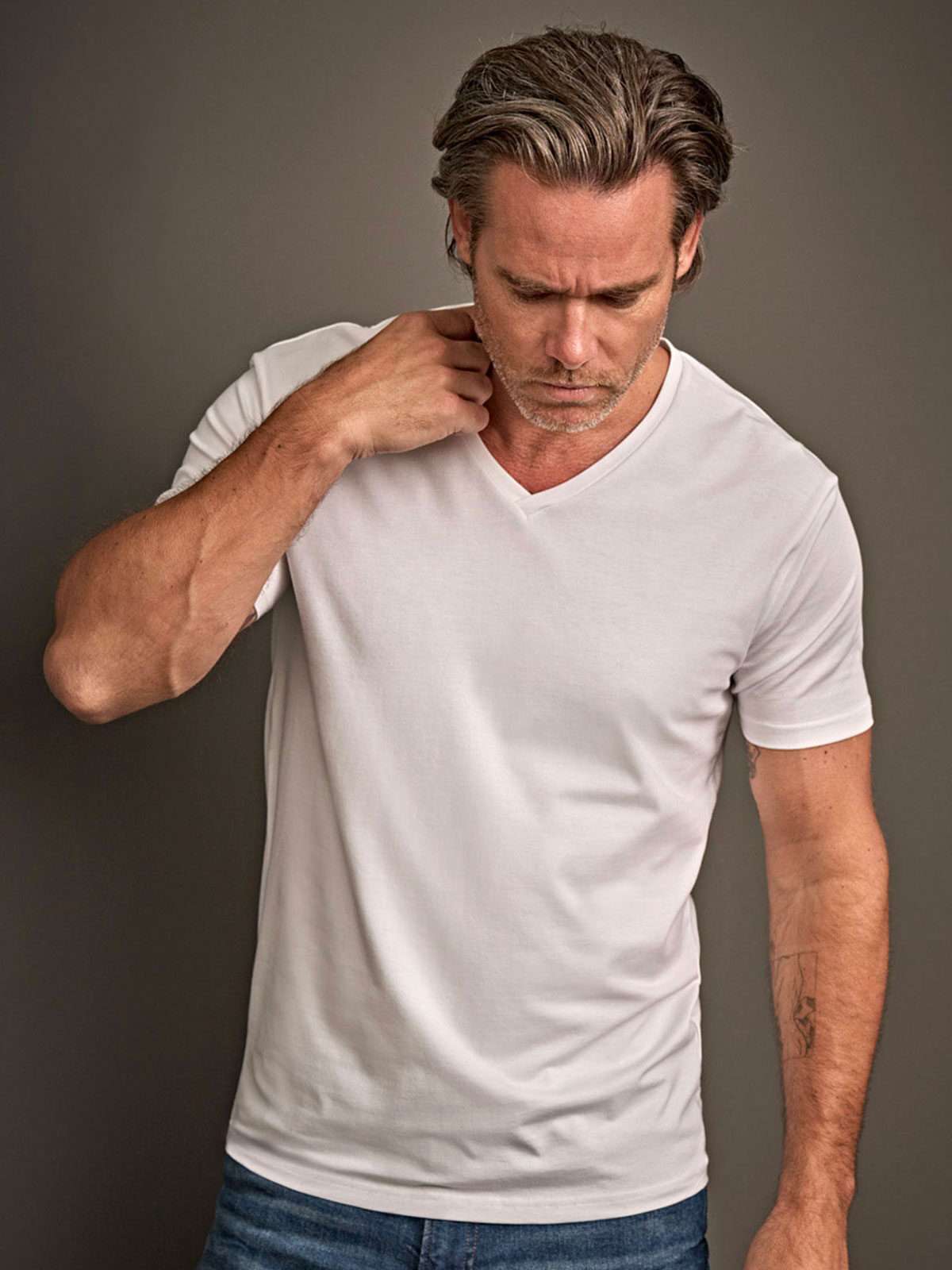 T-shirt uomo collo a V, 195 g/m², 90% cotone pettinato ring-spun, 10% elastan, elastan conferisce maggior stabilità e morbidezza, pre-ristretto, capo trattato con enzimi per un tessuto più soffice, fettuccia al collo, collo in Lycra, doppia cucitura