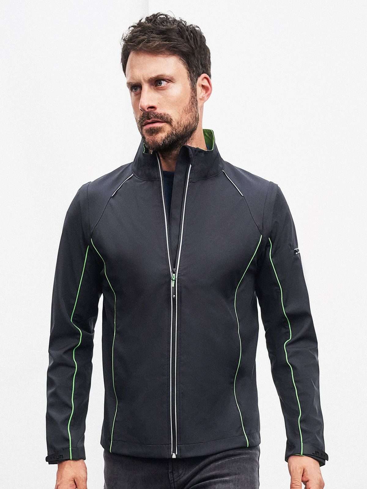 100% poliestere. Giacca in softshell con tessuto a 3 strati, membrana TPU, antivento e idrorepellente (colonna d'acqua 5.000 mm), traspirante e permeabile al vapore. Collo alto, piping a contrasto sul davanti, sul retro e sulle maniche. Cerniera anteriore nascosta, dettagli riflettenti su spalle, retro e maniche. due tasche laterali con zip, una tasca interna, tasca sulla manica con zip riflettente. Maniche staccabili.