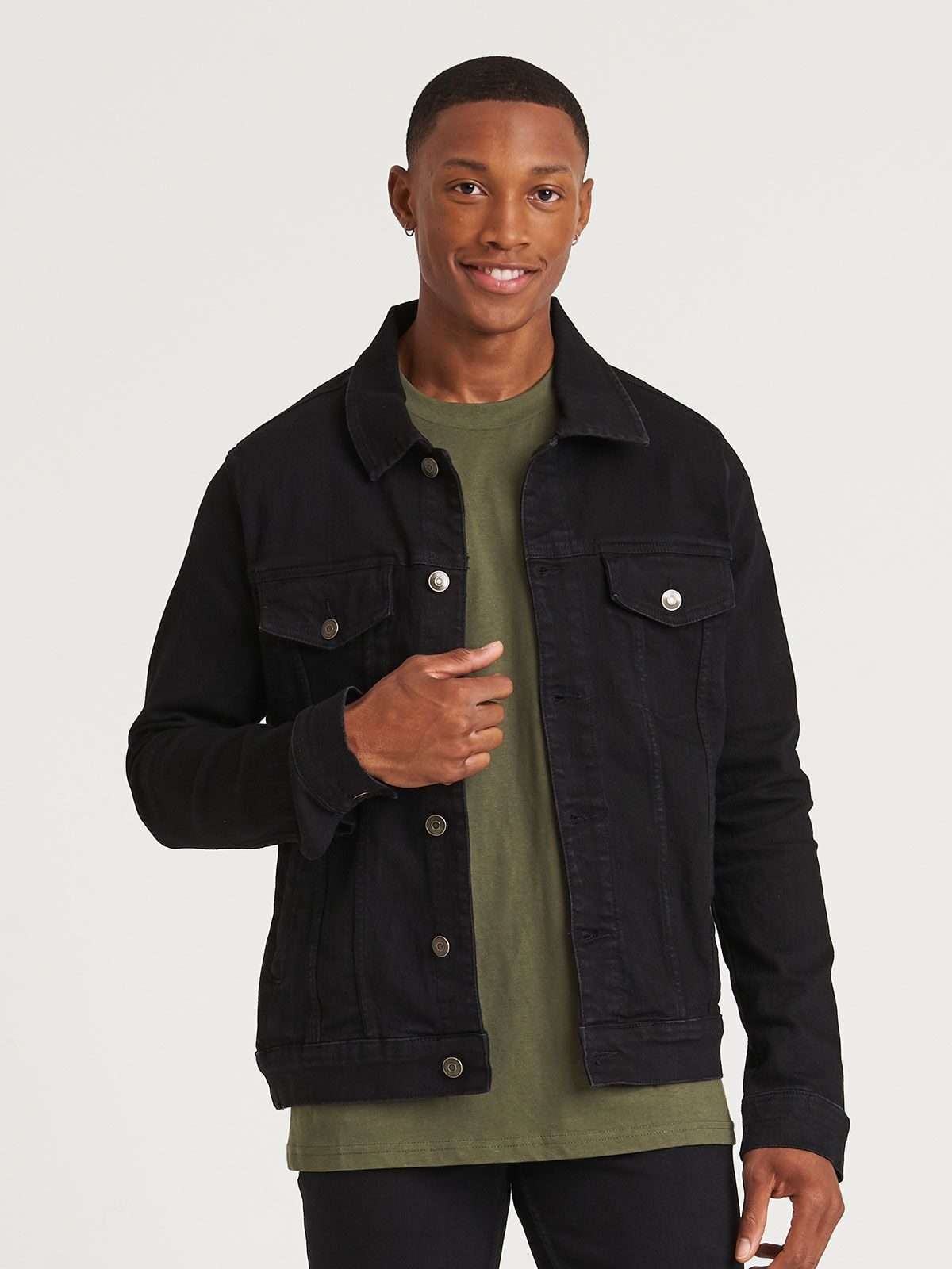 99% cotone, 1% elastan. Giacca da uomo in denim elasticizzato, 4 tasche, lavaggi nei colori blu scuro e chiaro, cuciture a contrasto, chiusura con bottoni automatici, dettaglio polsino con bottoni, passante posteriore sul retro.
