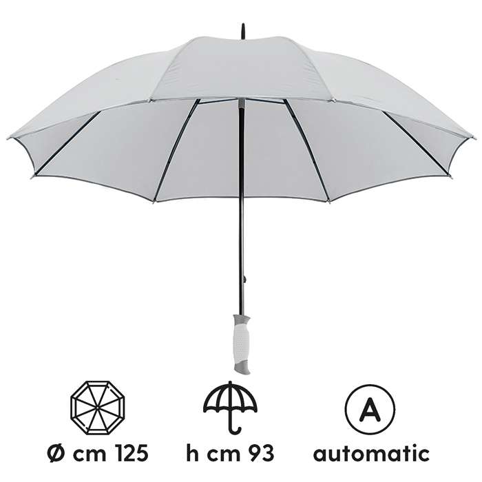 maxi ombrello automatico con profilo a contrasto; sistema di apertura con meccanica di alta qualit��; struttura in fibra di vetro; fusto e puntale in metallo; manico traforato; chiusura con velcro; tecnica di stampa consigliata: serigrafica - transfer