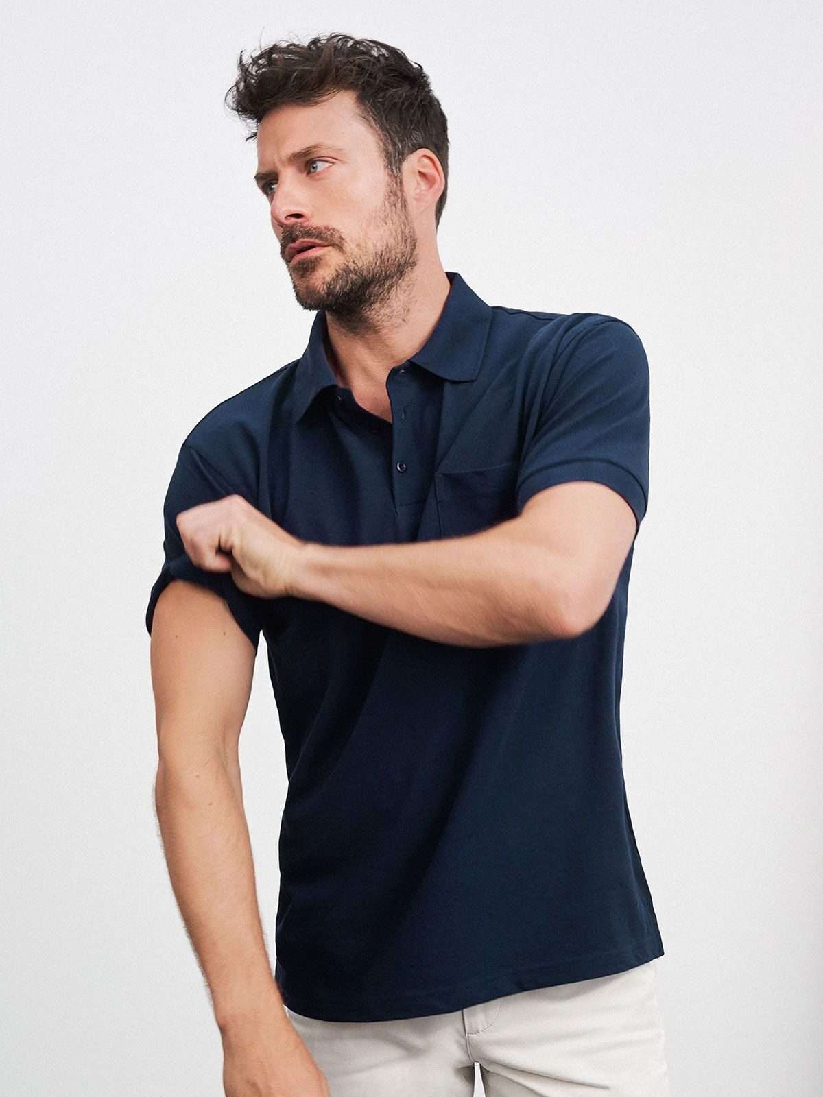 60% cotone, 40% poliestere. Polo piqué classica con taschinoPiqué finemente strutturato di alta qualità. Colletto polo e bordini manica lavorati a maglia, spacchetti laterali. Taschino applicato, necktape, bottoni tono su tono. Cuciture doppie sulle spalle e sul giro manica, Tessuto esterno (210 g/m²). Cotone/Fibra sintetica, Taschino, Manica corta,