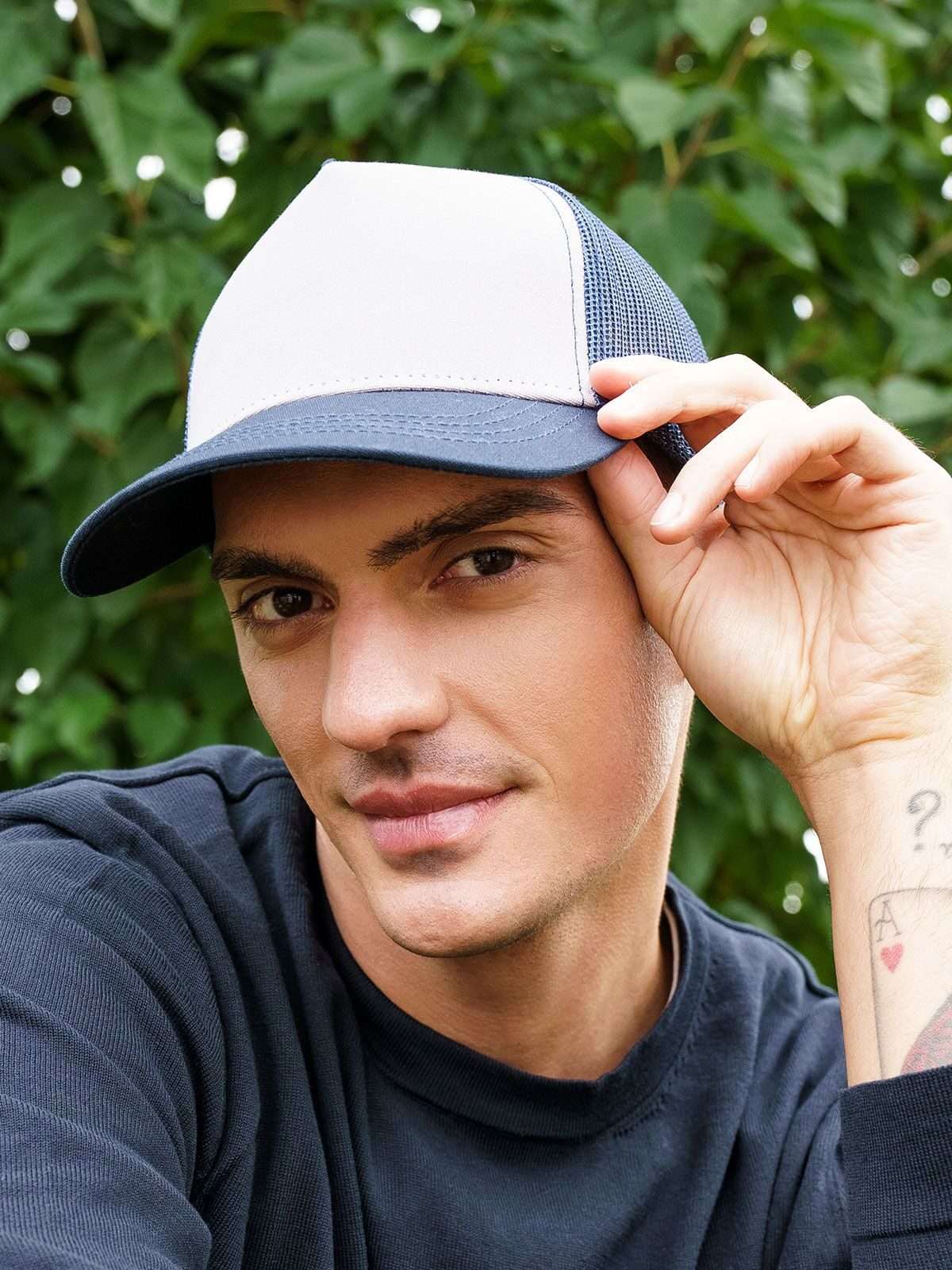 100% tela di poliestere riciclato, lato e retro: 100% rete di poliestere riciclato. Cappello a 5 pannelli, tela e rete posteriore in poliestere riciclato, visiera mediamente curva, etichetta removibile.