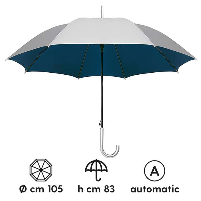 ombrello automatico; sistema di apertura con meccanica di alta qualit��; struttura in fibra di vetro alta resistenza; manico e puntale in plastica silver; chiusura con velcro; tecnica di stampa consigliata: serigrafica - transfer