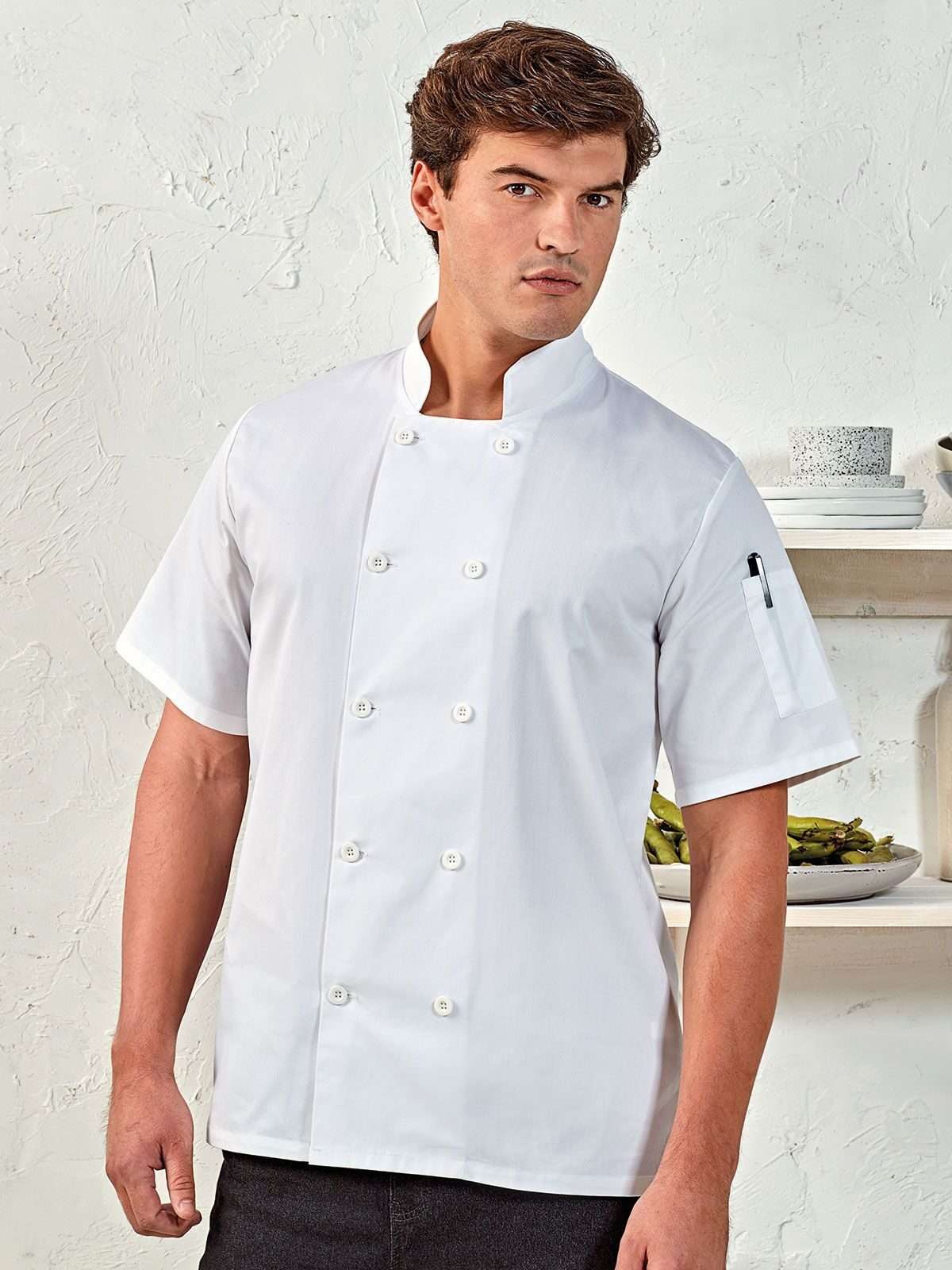 65% poliestere 35% cotone twill. Giacca da cuoco a manica corta con collo alla coreana, chiusura a strappo con dieci bottoni, bottoni in resina di alta qualità, di lunga durata, tasca per penne a sinistra, taglia unisex. Lavabile a 60°C.
