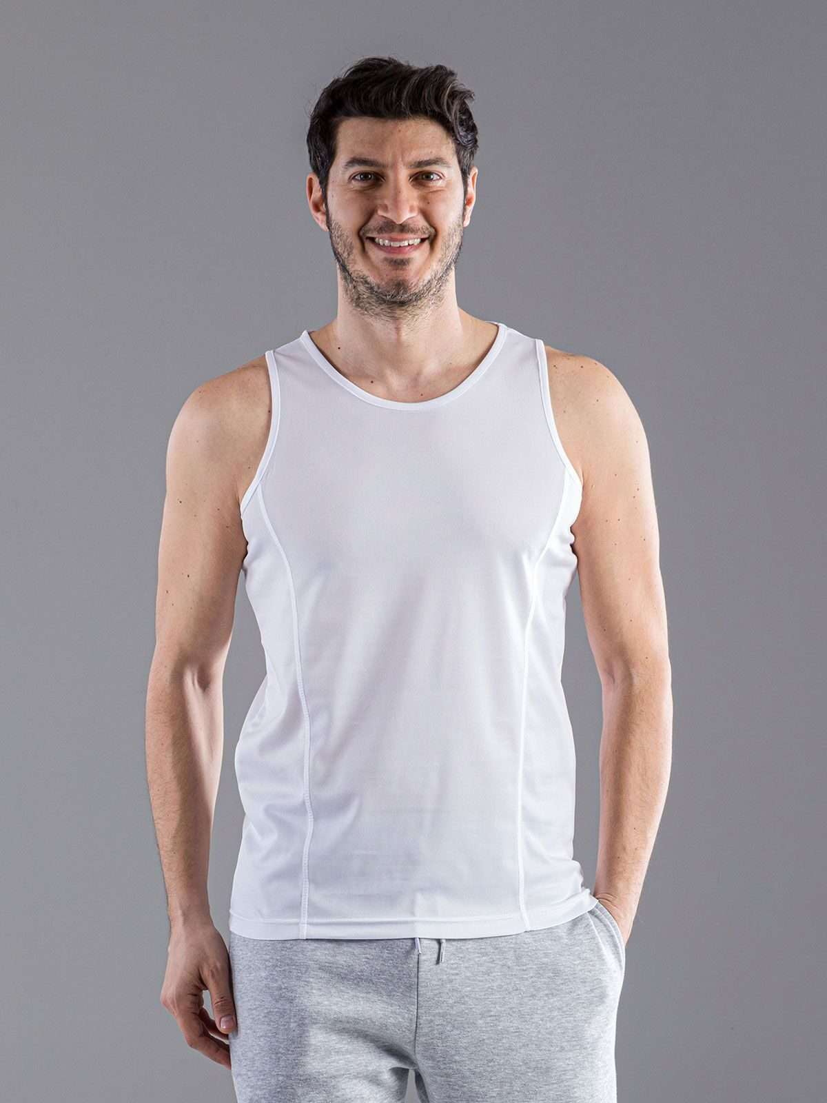 100% poliestere. Canotta tecnica, tessuto traspirante per massimo comfort e facilità di lavaggio, vestibilità comoda, etichetta strappabile. Cuciture laterali.