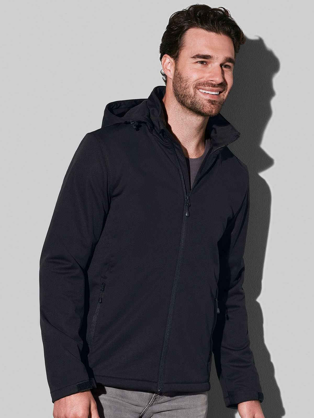 100% poliestere. Giacca softshell uomo con tessuto a 3 strati impermeabile (5.000 mm) e traspirante (1.000 g/m²), mezzaluna centrale posteriore per la personalizzazione, polsini e orlo regolabili, tasca interna, cappuccio rimovibile e regolabile, 2 tasche laterali con cerniere di alta qualita', bordo di protezione dal vento, etichetta Premium con la taglia tessuta sulla nuca, ed etichetta di manutenzione a strappo nella cucitura laterale, senza fluoro e PFC.