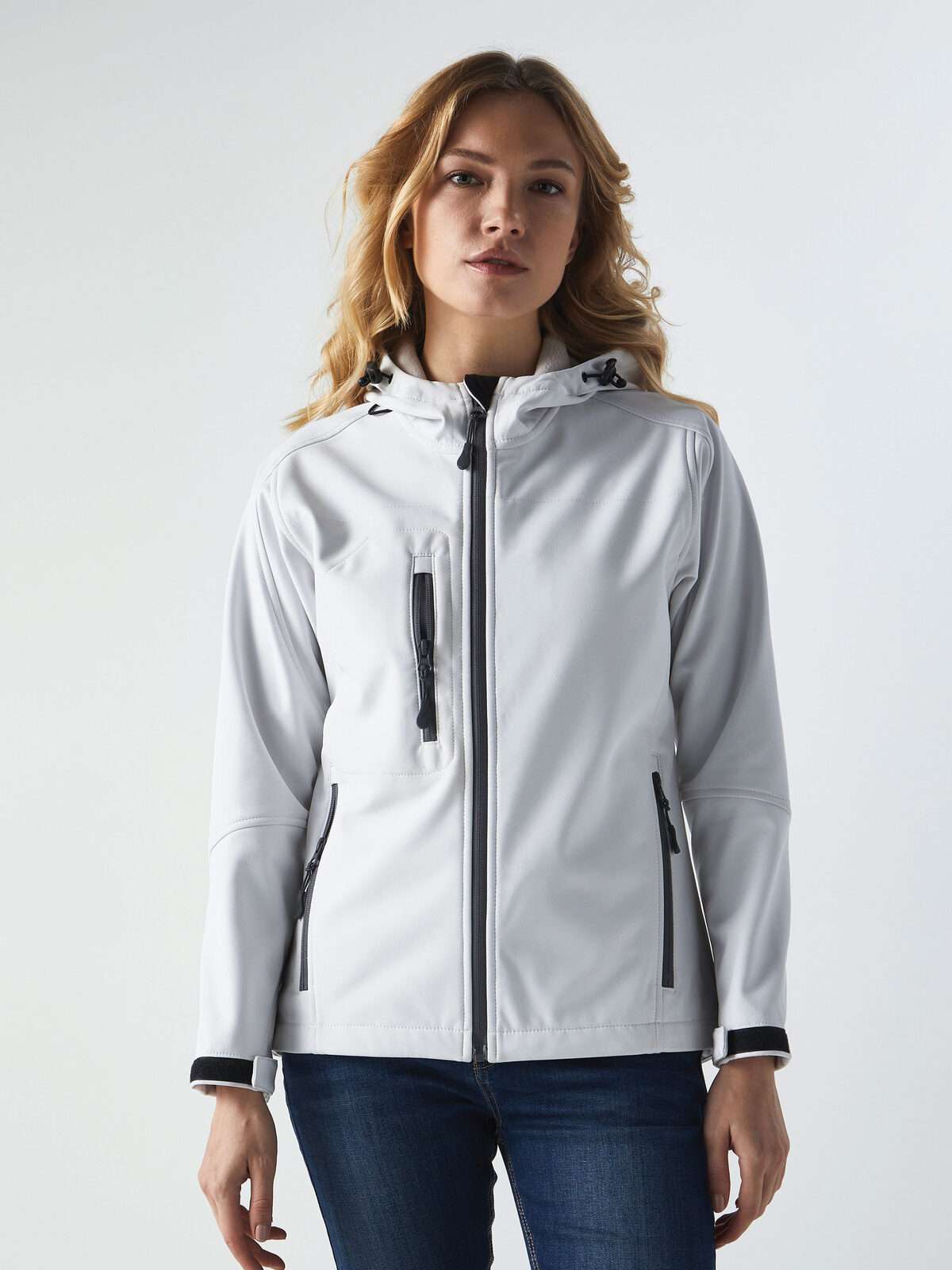 94% poliestere, 6% elastan. Giacca da donna in softshell a 3 strati, cappuccio con fermi in plastica, occhielli e cordino neri.Due tasche laterali con zip, una taschino sul petto con zip, tirazip in plastica, zip interna lato cuore per la personalizzazione, polsini regolabili con velcro, interno in micropile. Bordo inferiore con cordino regolabile con fermi.Impermeabilità 8000 mm, traspirabilità 1000 gr/m2. Etichetta strappabile.